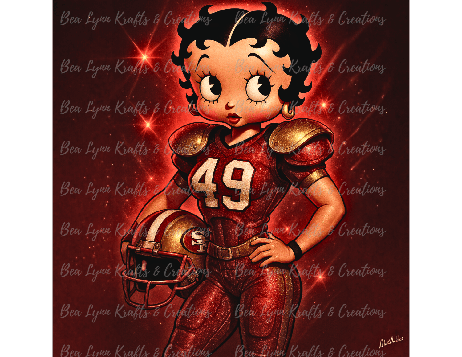 Get ready to bring the heat with this jaw-dropping Betty Boop 49ers PNG! Styled in sparkling red and gold glitter, Betty is geared up in a powerful football uniform featuring jersey number 49, striking the perfect pose for die-hard fans. This high-resolution transparent PNG is perfect for turning your love for the San Francisco 49ers into show-stopping merch and unforgettable game day gear!