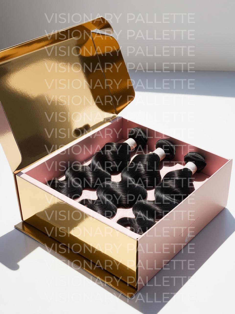 Pink and Gold Open subscription box with realistic black Wavy hair bundles inside