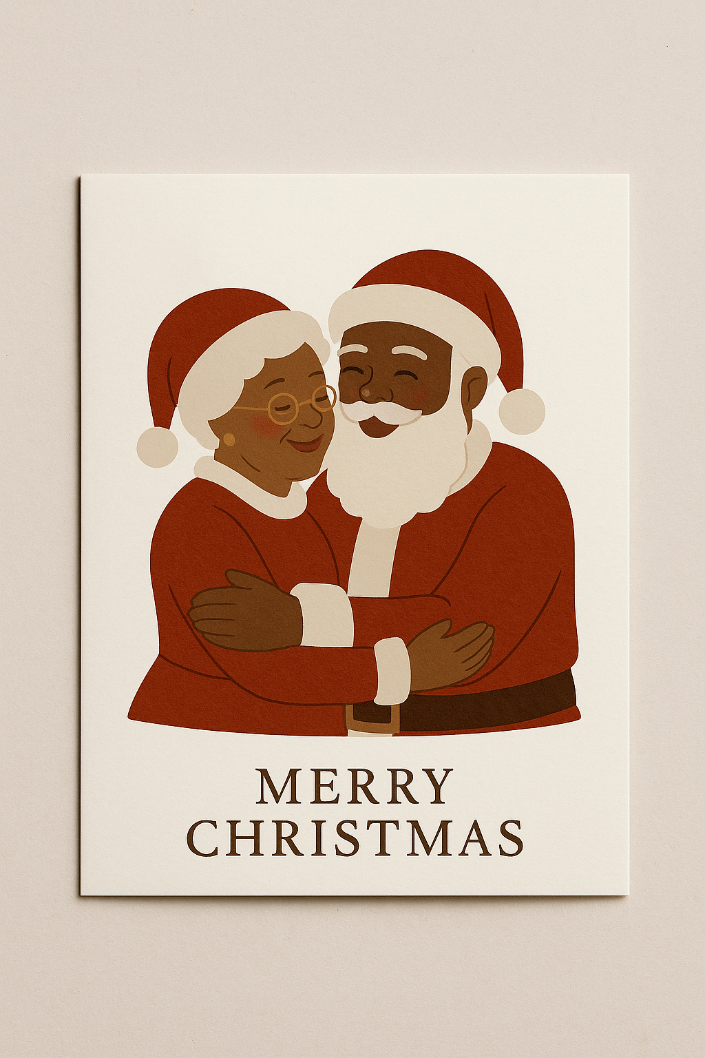Celebrate Christmas with love, joy, and beautiful representation. This Black Mr. & Mrs. Santa Claus Christmas card captures the warmth of the season through a timeless illustration of Santa and Mrs. Claus embracing—reimagined to honor Black love, family, and tradition.