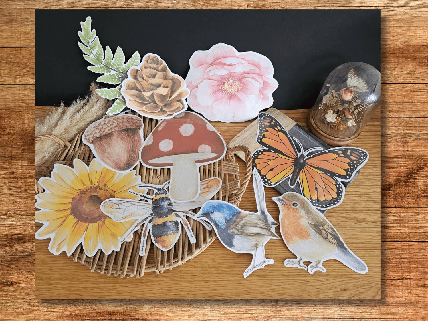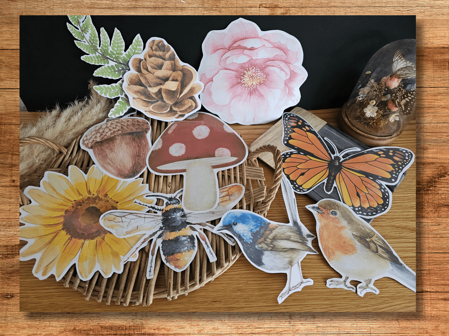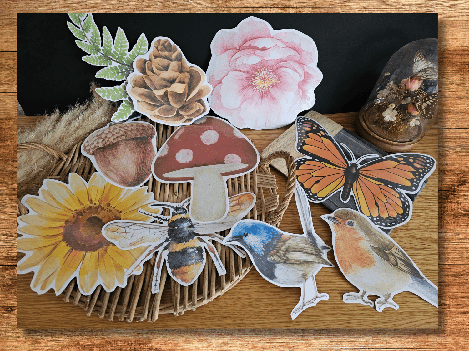 This pack includes, a pinecone, sunflower, fern, superb fairywren, robin, acorn, butterfly, mushroom and bee!