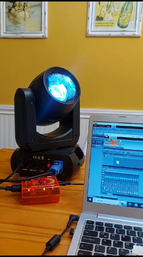 * Verifique en su fixture, que el canal 6 sea el dimmer, el canal 8 en el valor 30 corresponda al color Amarillo y que el canal 9 en el valor 30 sea el Gobo de la estrella.