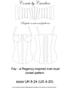 This is a 10-panel (plus 2 cup panels) Regency-inspired bodice pattern. It has a gentle curve as was fashionable in the Regency period (1795-1837). Sizes (UK) 8 -24 (US 4 - 20).