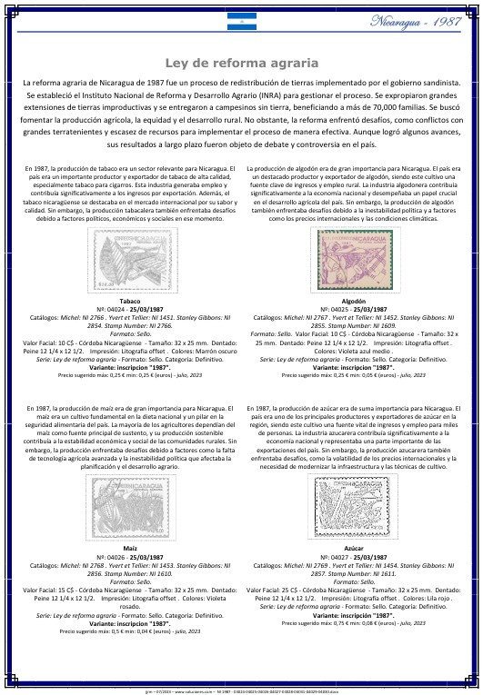 Ficha digital en PDF sobre los sellos emitidos en Nicaragua en 1987 dedicados a la reforma agraria (Catálogo Sooluciones NI-1987-04024-04025-04026-04027-04028-04031-04029-04030).