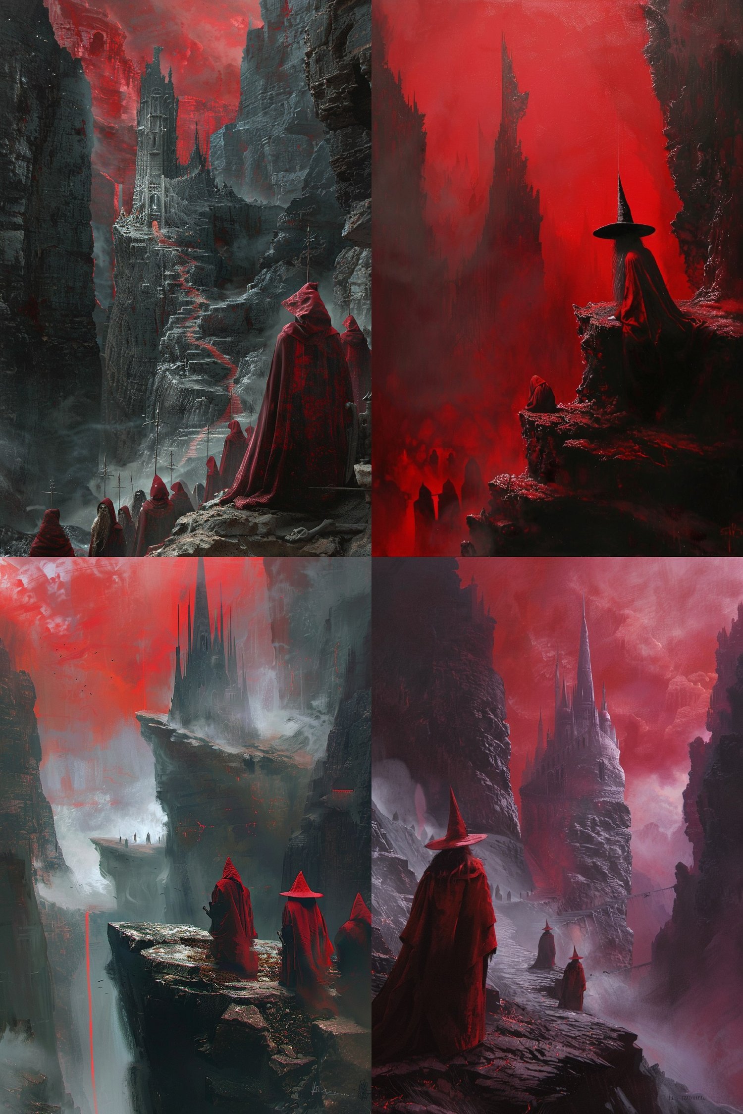in a gothic red sky — living hat whispering, dramatic fog, oil