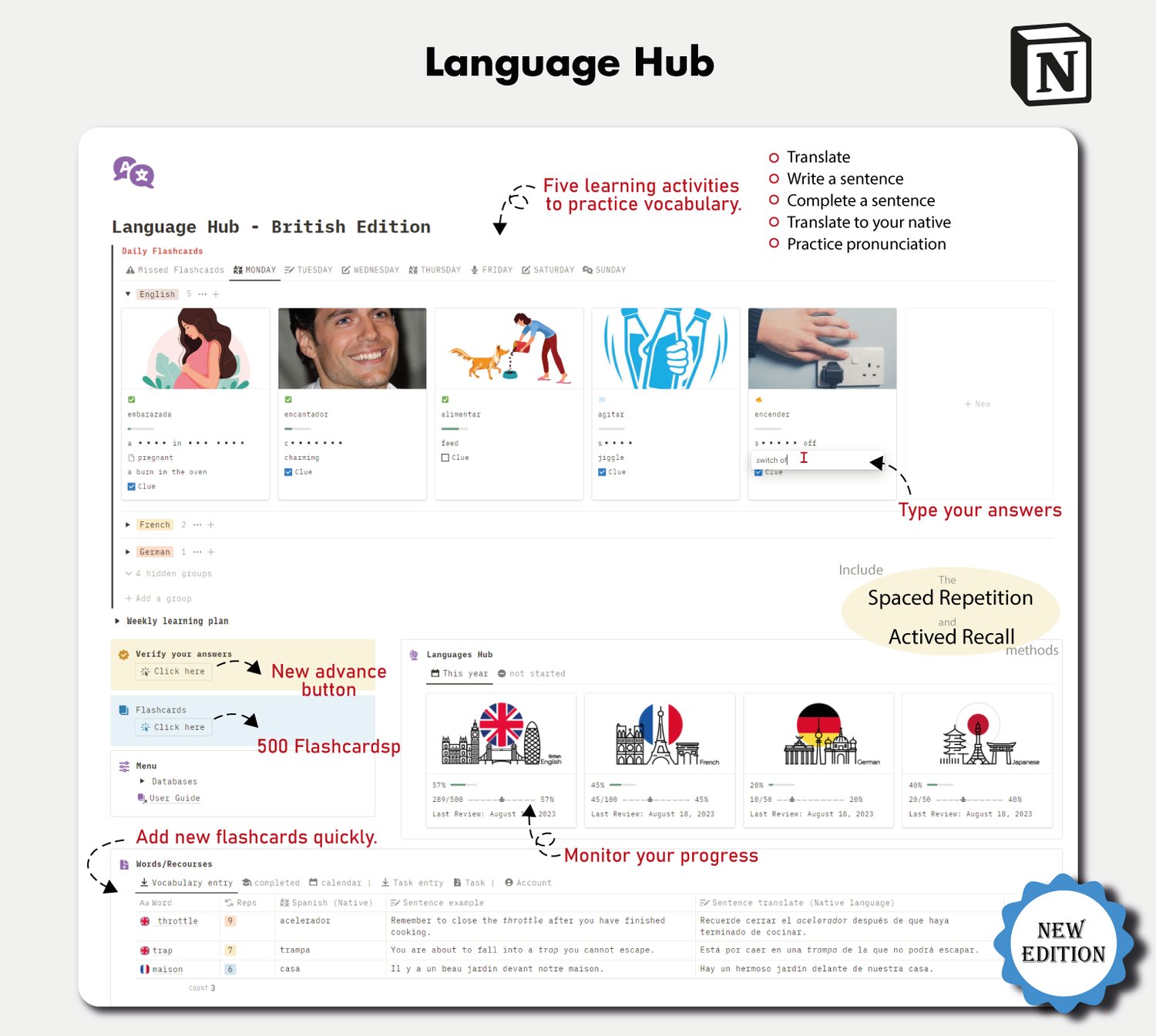 This Language Hub template is a great choice for anyone who wants to learn a new language or improve their existing skills. It is a Notion template that helps you manage your learning resources, track your daily studying, and review your vocabulary with flashcards and practice with a spaced repetition system.
