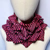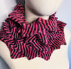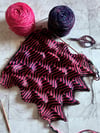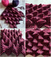 Striped garter stitch with stacked increase/decrease columns placed in offset orientations, create deep dimensional points… The inclusion of a 1 stitch Stockinette column above the stacked decreases causes a curvature reminiscent of claws, teeth or beaks. When joined in the round like this, it adds a whirling rotational effect.