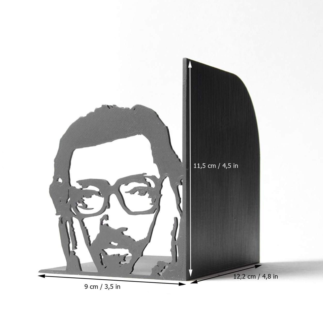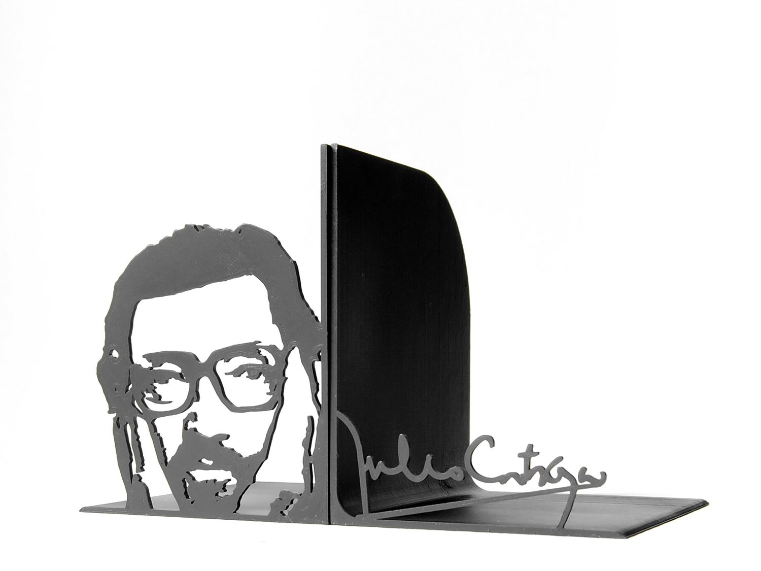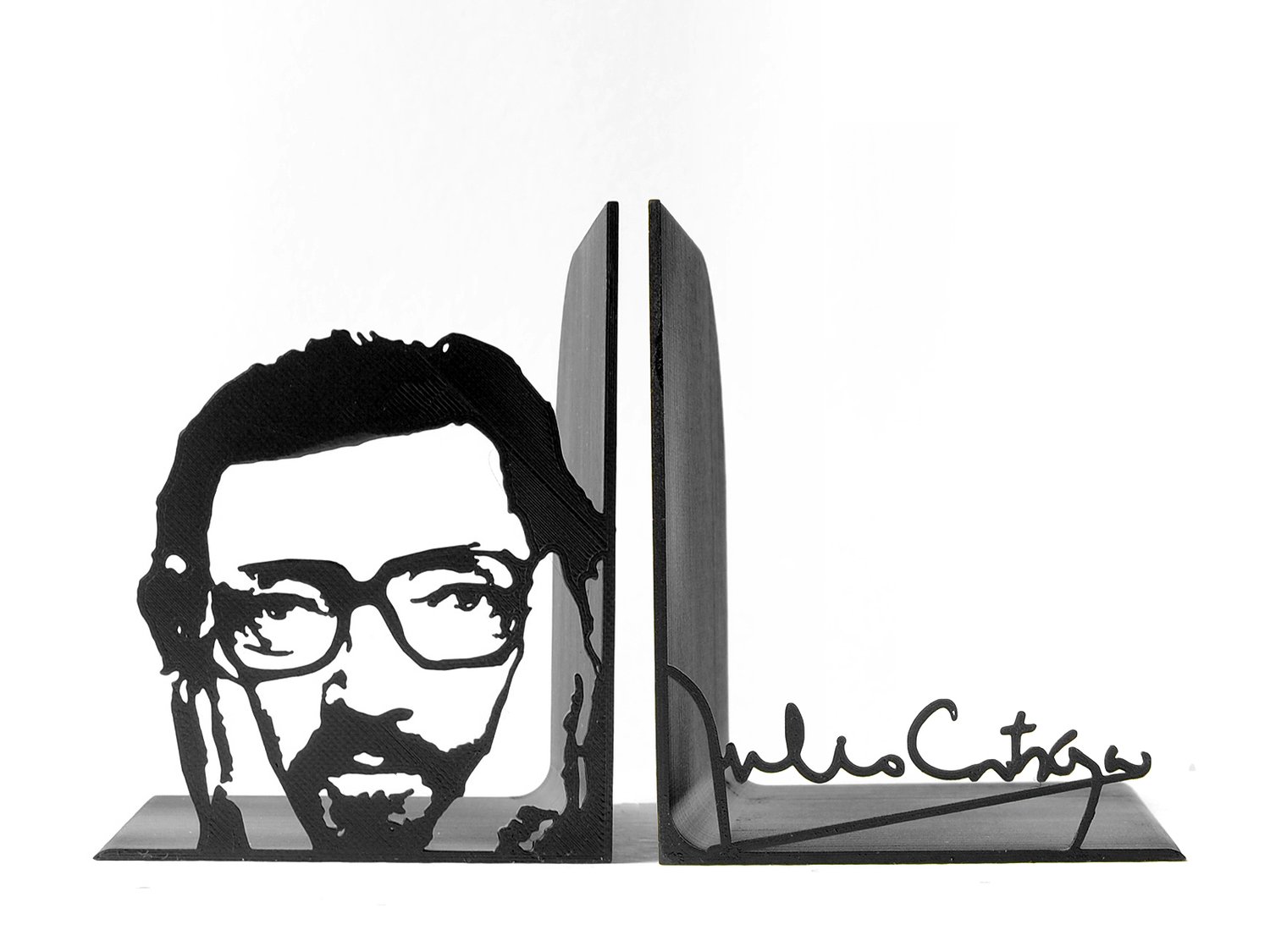 Bookends depicting Argentinean author Julio Cortázar. 3d printed in PLA, painted in black.