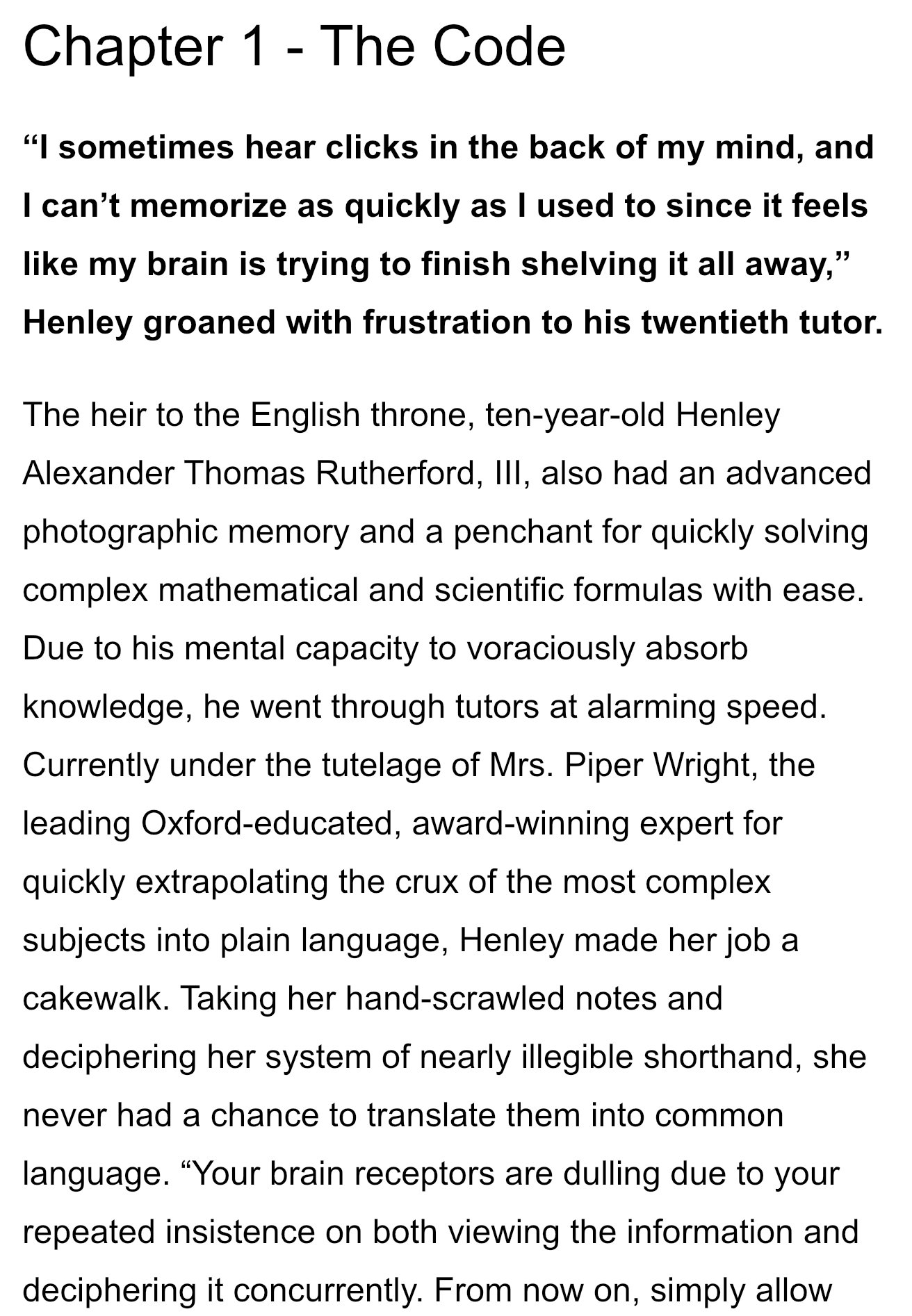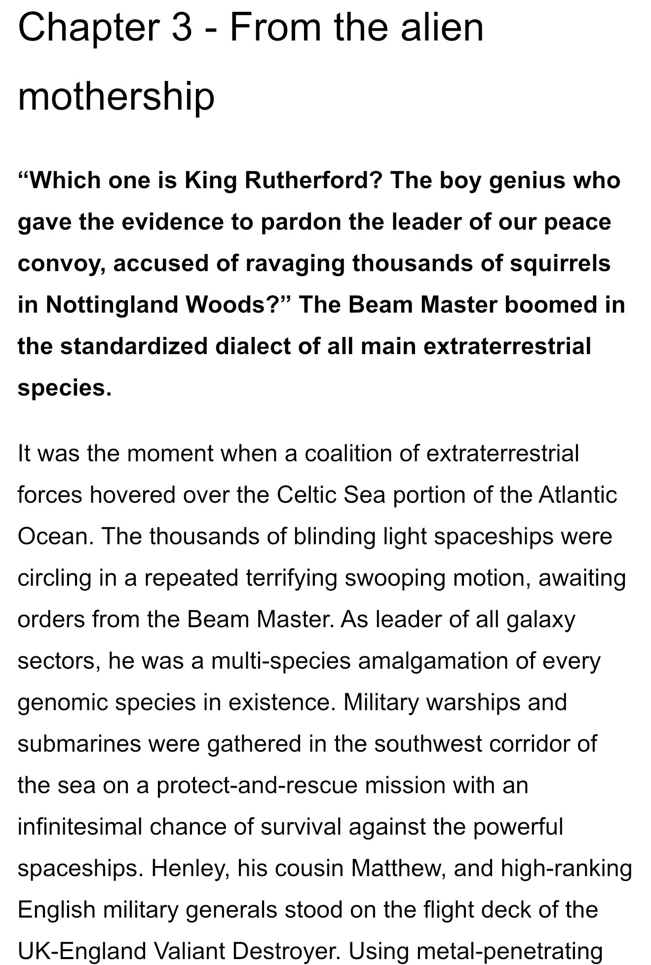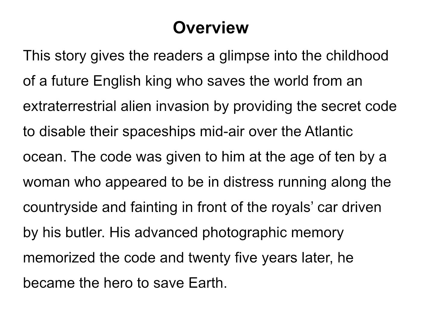 Free Audio Preview! (Book & Chapter 1 Audio). This story gives the readers a glimpse into the childhood of a future English king who saves the world from an extraterrestrial alien invasion by providing the secret code to disable their spaceships mid-air over the Atlantic ocean. The code was given to him at the age of ten by a woman who appeared to be in distress running along the countryside and fainting in front of the royals’ car driven by his butler. His advanced photographic memory memorized the code and twenty five years later, he became the hero to save Earth.
