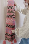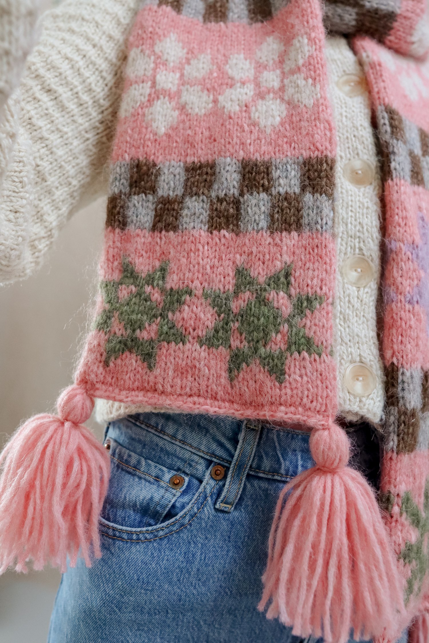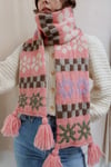 The Quinty Quilt Scarf is knit from tip to tip in the round using circular needles. The edges are finished using a crochet hook. Lastly, fluffy tassels are added on each corner of the scarf.