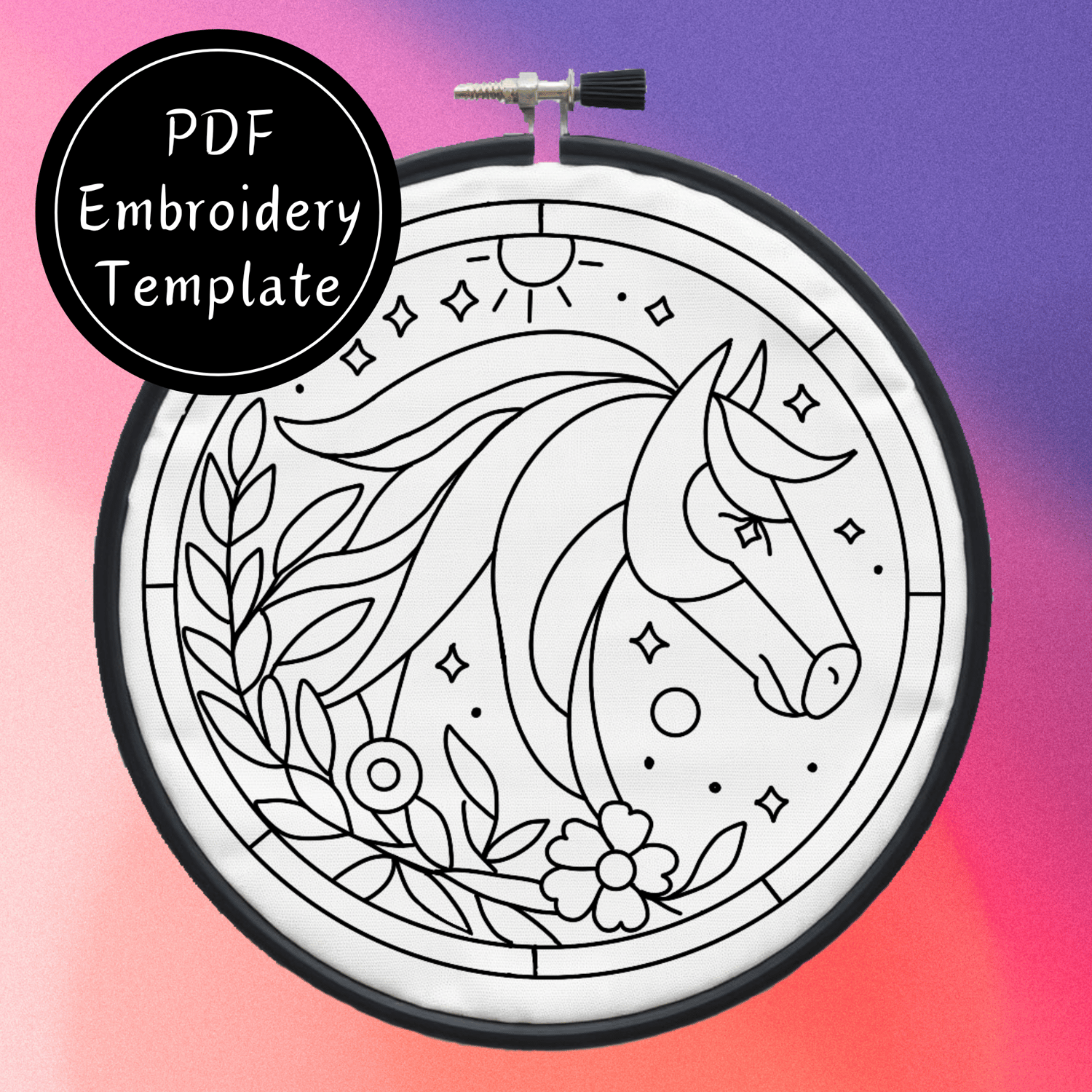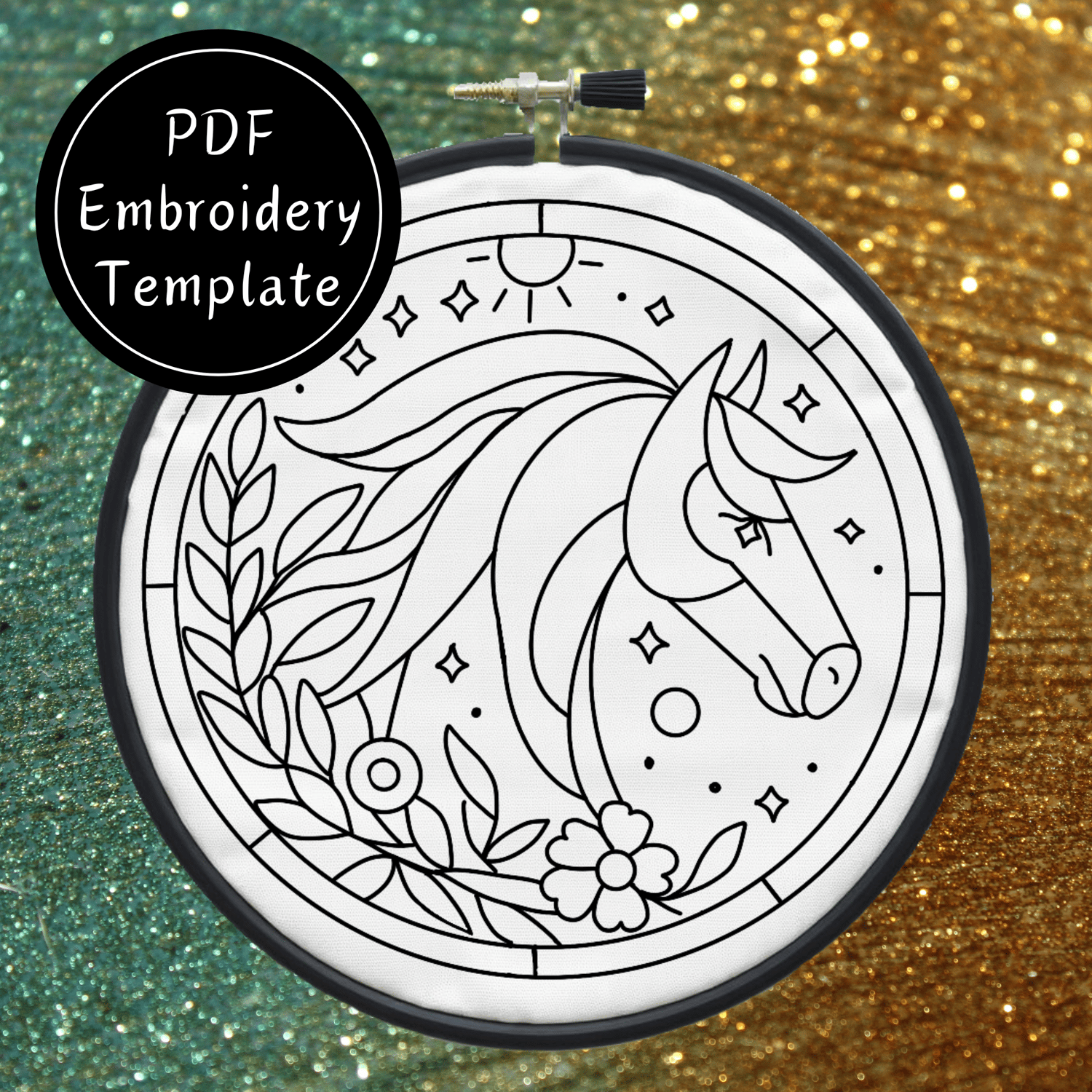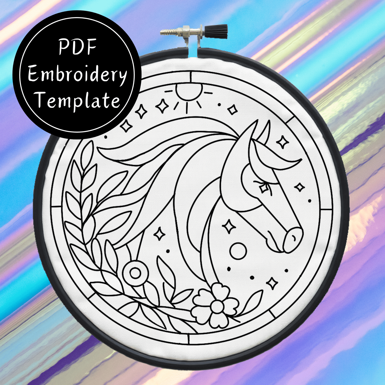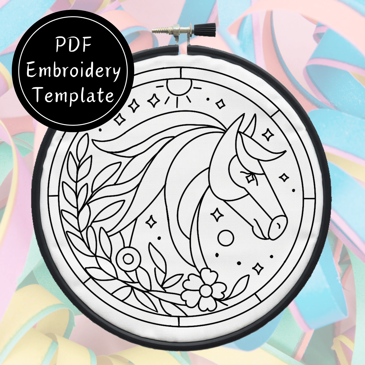 Stained Glass Horse With Flowers Hand Embroidery Pattern DIY Embroidery