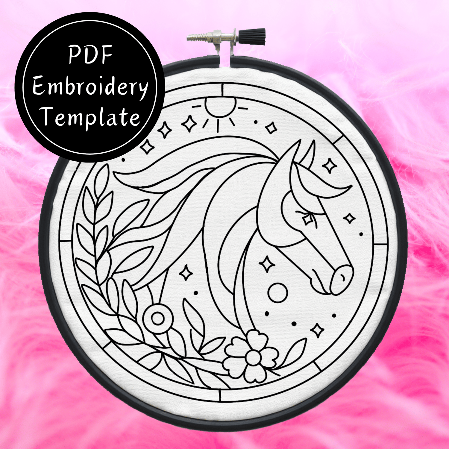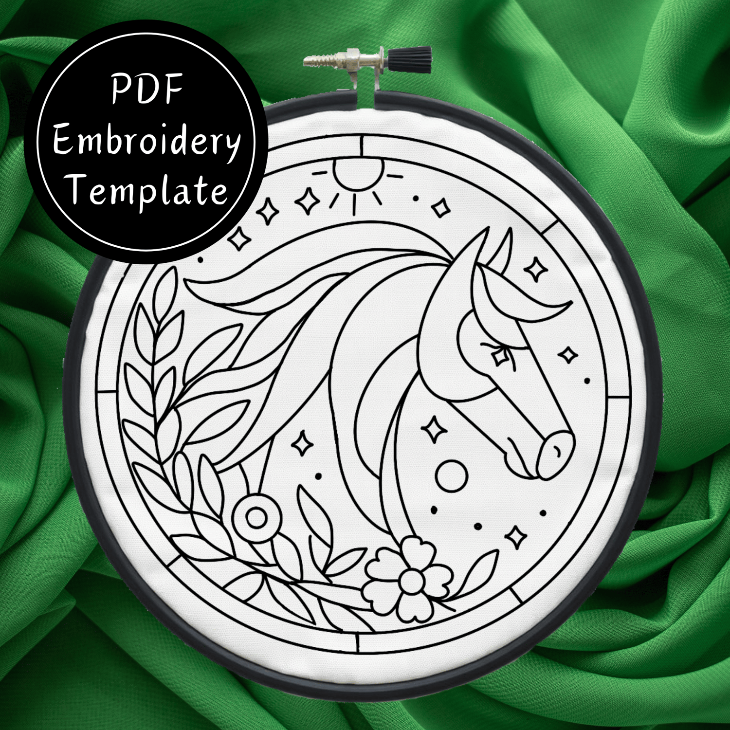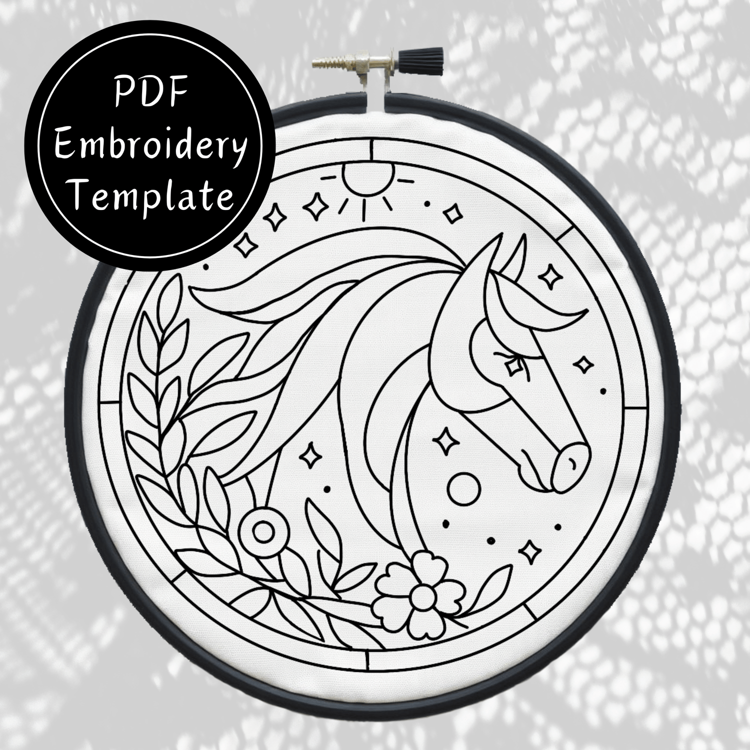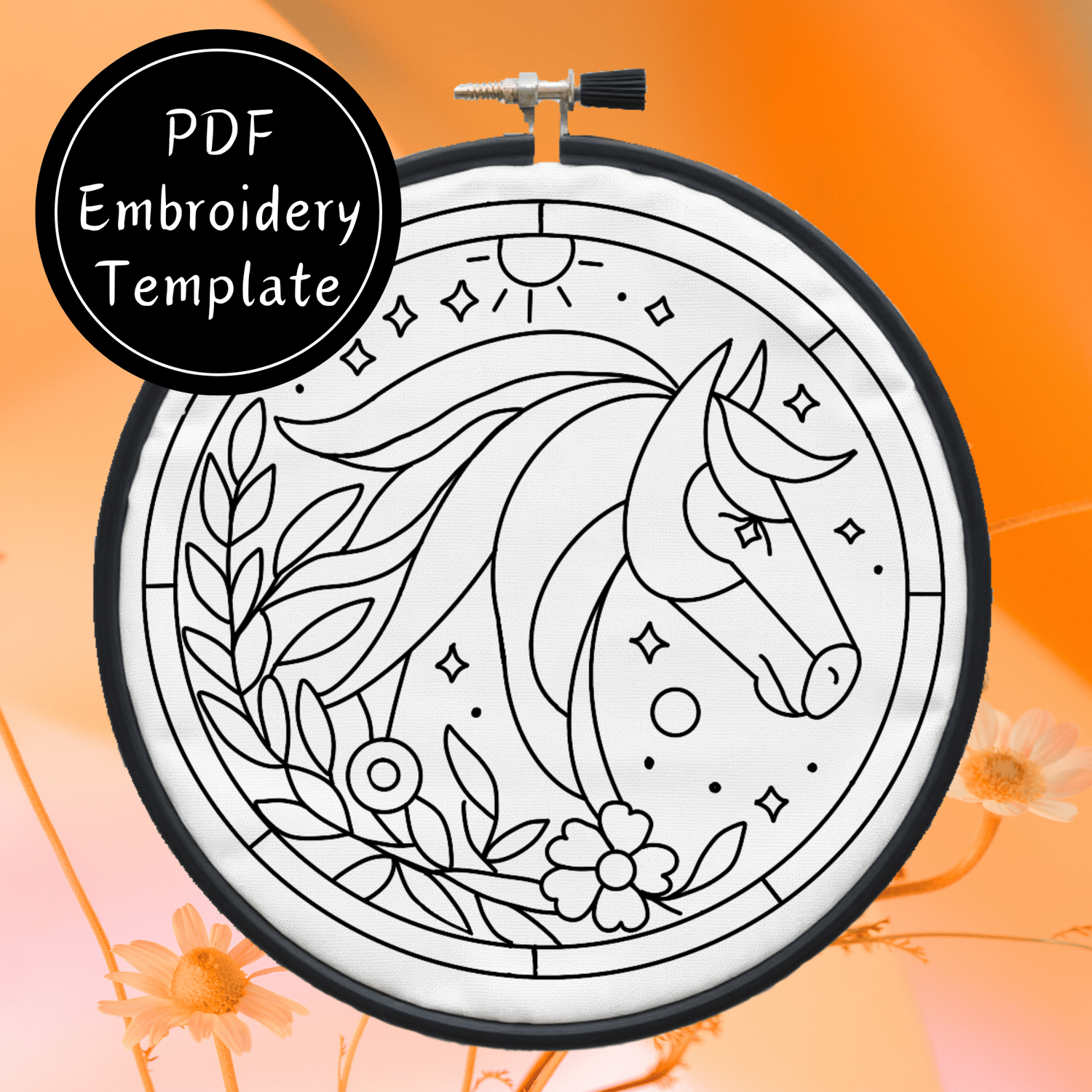 Stained Glass Horse With Flowers Hand Embroidery Pattern DIY Embroidery