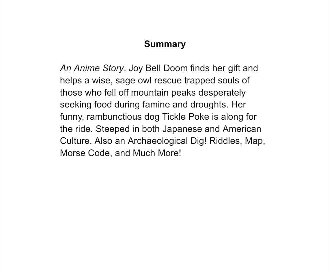 An Anime Story. Joy Bell Doom finds her gift and helps a wise, sage owl rescue trapped souls of those who fell off mountain peaks desperately seeking food during famine and droughts. Her funny, rambunctious dog Tickle Poke is along for the ride. Steeped in both Japanese and American Culture. Also an Archaeological Dig! Riddles, Map, Morse Code, and Much More!