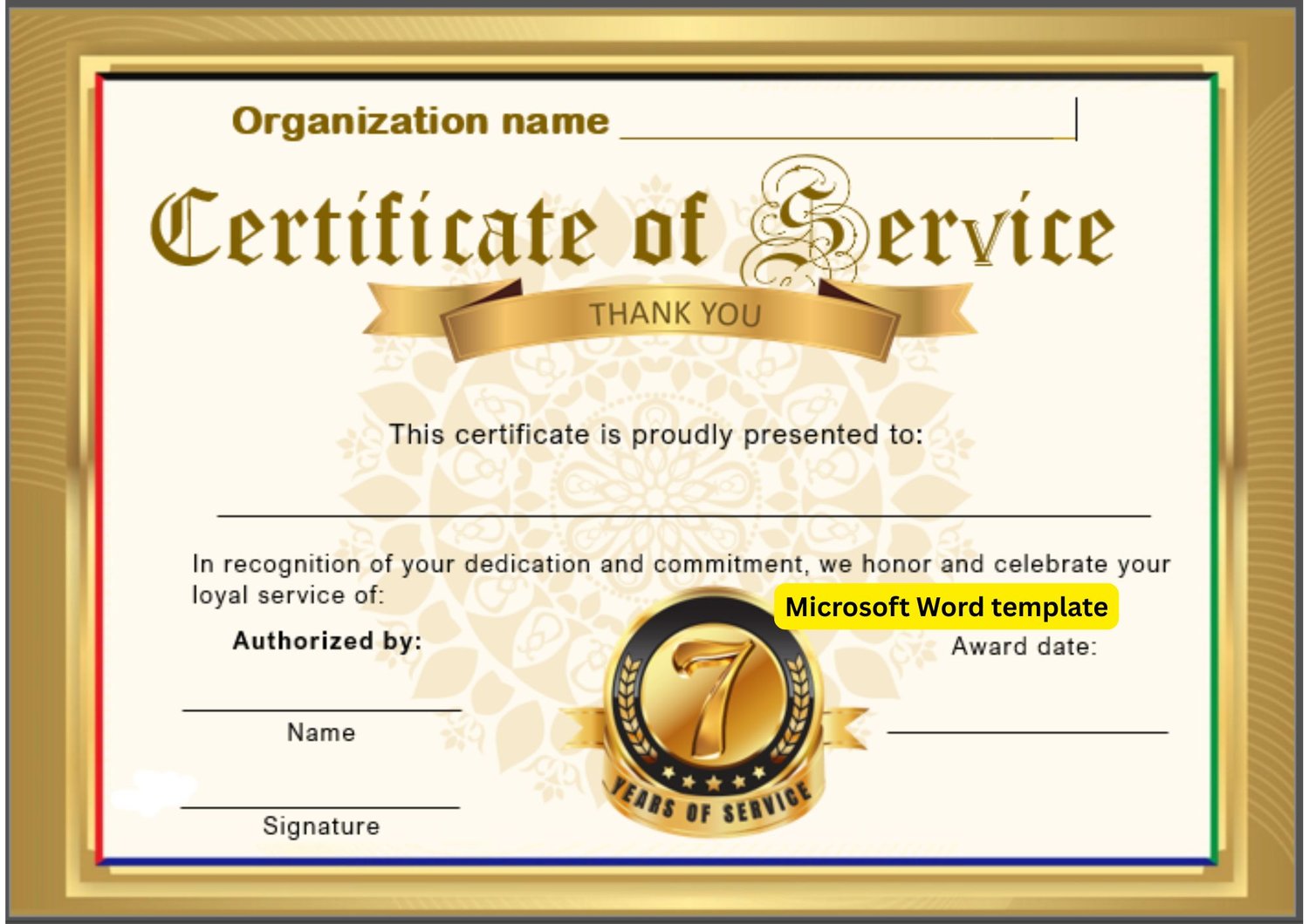 This is a professional landscape certificate template to recognize years of service. Fully editable in Microsoft Word — customize with names, dates, and details