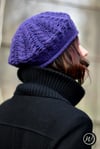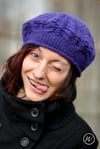 Elourne is an elegant, sculptured beret featuring mirrored cables and lace, creating structure and warmth.