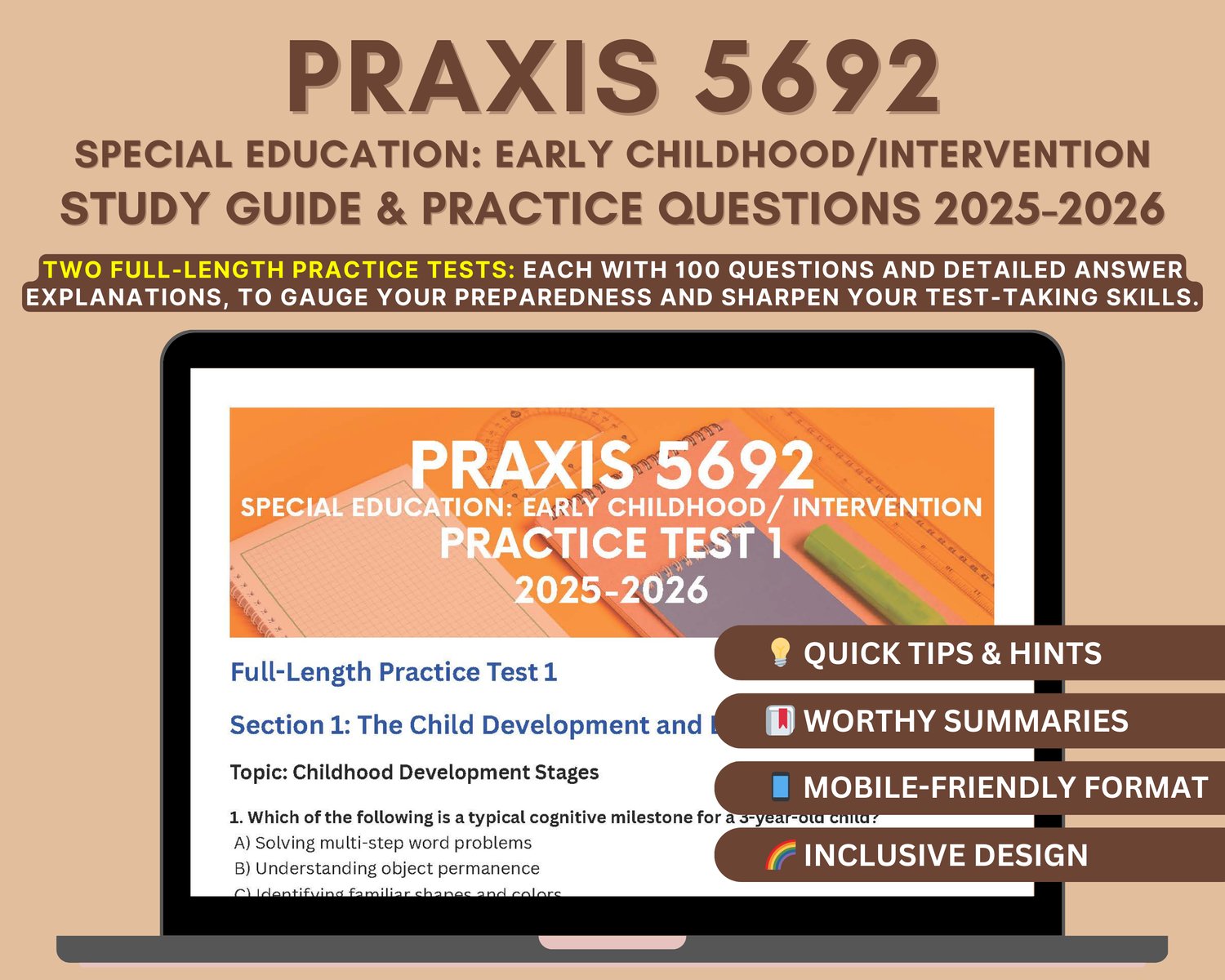 Are you preparing for the Praxis Special Education: Early Childhood/Early Intervention (5692) Exam in 2025-2026? Our comprehensive study guide is designed to give you everything you need to succeed. With clear explanations, practice questions, and test-taking strategies, this guide will help you master all the essential topics covered on the exam. Perfect for teachers, future educators, and those pursuing a career in special education!