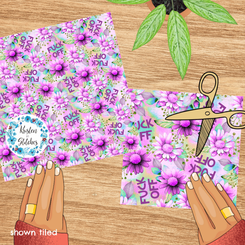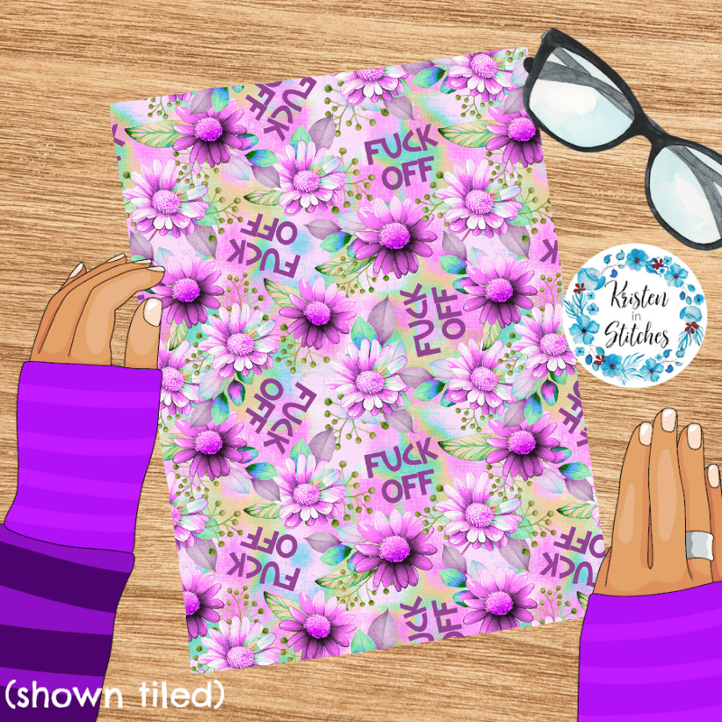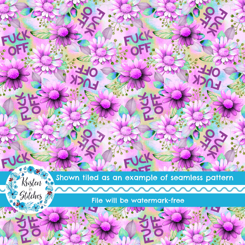 Fuck Off Swear Word Seamless Pattern, Pretty Profanities, Purple Daisy Flowers