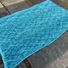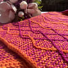 The Comet Trails Blanket features a repeating cable motif that looks strikingly different in each repetition. In actuality, the cabling is the same for each motif, only the colour placement changes.