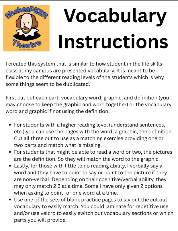 Theatre teachers have struggled to understand and have resources to include the life skills kids that we have in our theatre classes, not because of lack of desire but lack of special ed. experience, time, and resources. The beginning of the year and other times are especially difficult when we need to cover the basics such as vocabulary.