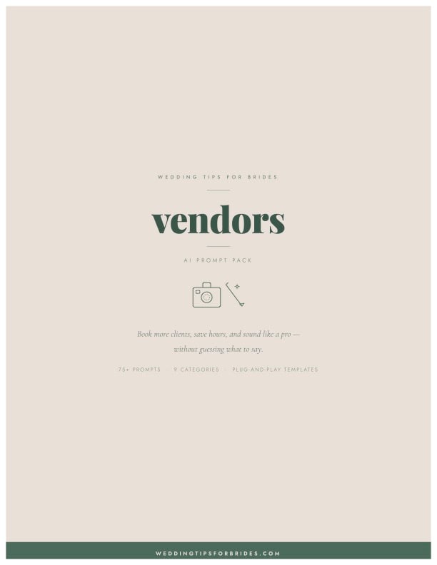 This Wedding Vendor AI Business Bundle gives you 75+ proven prompts you can use with ChatGPT to handle inquiries, follow-ups, pricing conversations, and client communication in minutes.