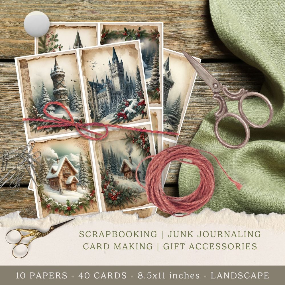 Create magical winter journals with this Whimsical Christmas Cottages Printable Set — a stunning collection of vintage-style snowy cottages, rustic cabins, and enchanted tower illustrations. Designed for junk journals, scrapbooks, cardmaking, planners, and DIY holiday crafting.