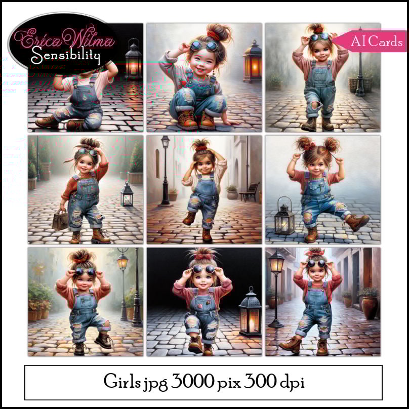 This adorable card set features 9 beautifully rendered AI illustrations of a playful little girl in denim overalls, posing in charming cobblestone streets lit by vintage lanterns. Each design captures a different sweet moment – from cheeky poses with sunglasses to playful running and cute standing poses – perfect for adding a whimsical touch to your projects.
