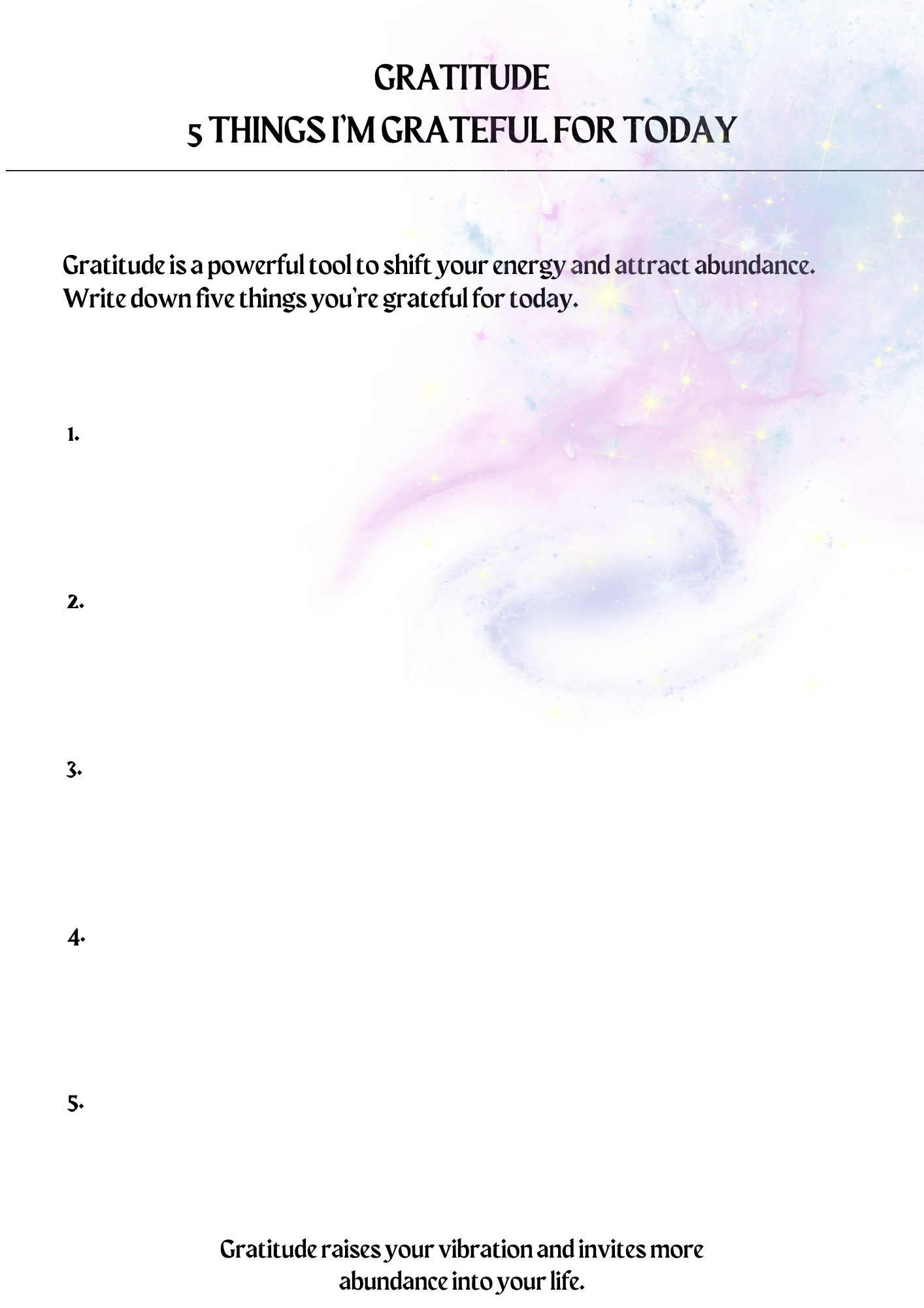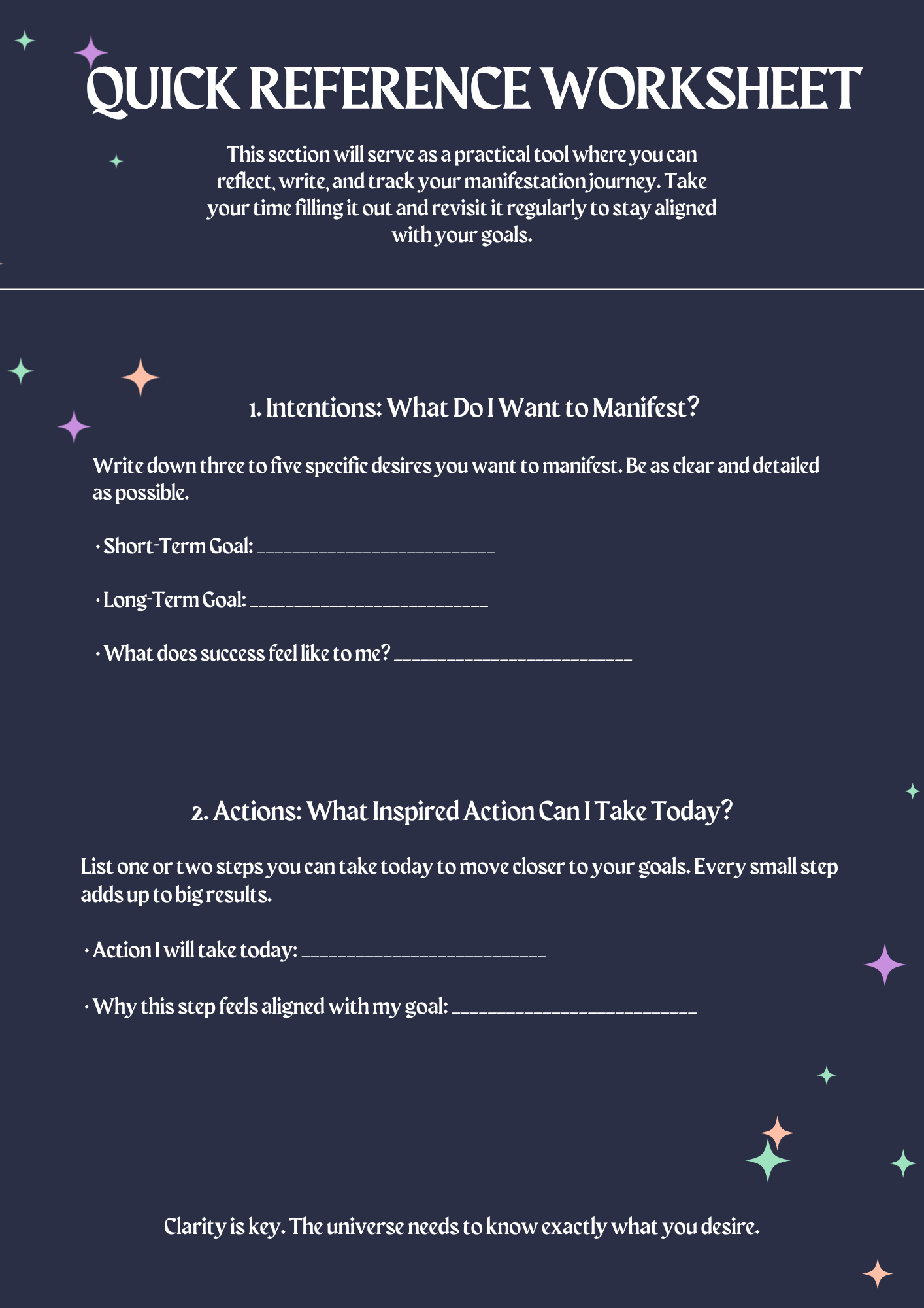 Quick Reference Worksheet: Stay organized with prompts to clarify your desires, actions, affirmations, and blockages, while tracking your gratitude daily.