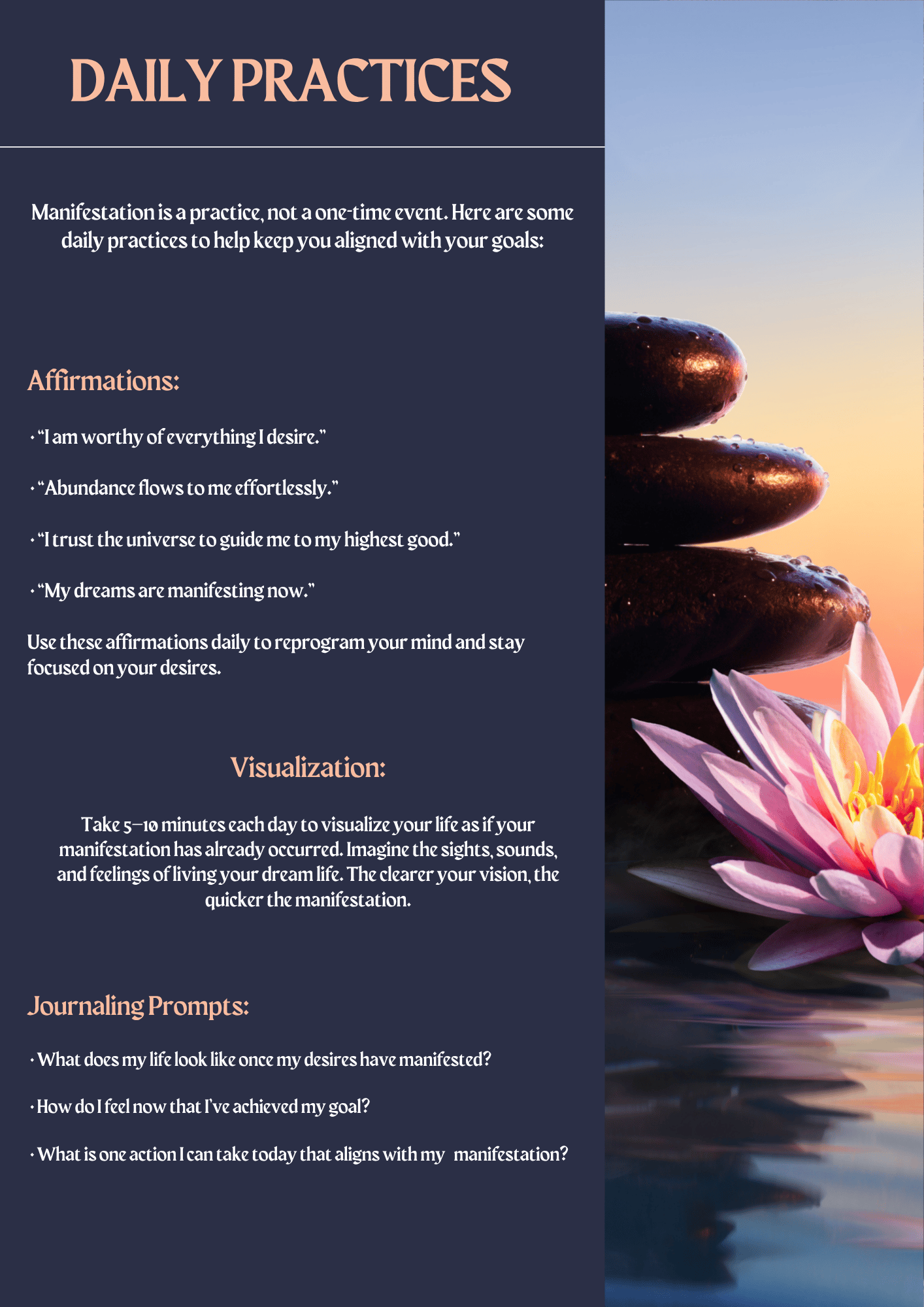 Daily Practices: Incorporate affirmations, visualization, journaling prompts, and gratitude exercises into your routine to stay aligned with your goals.