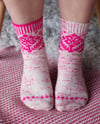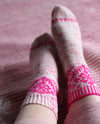 These cuff-down socks feature a beautiful Scandinavian style colourwork motif around the ankle and a smaller motif around the foot.