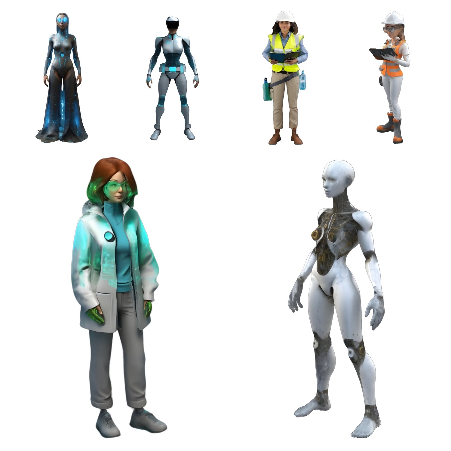 Collection features six unique character models, including futuristic androids and professional workers. Models show variety in design from sleek sci-fi aesthetics to practical work wear. Suitable for gaming assets, collectibles, or display pieces.