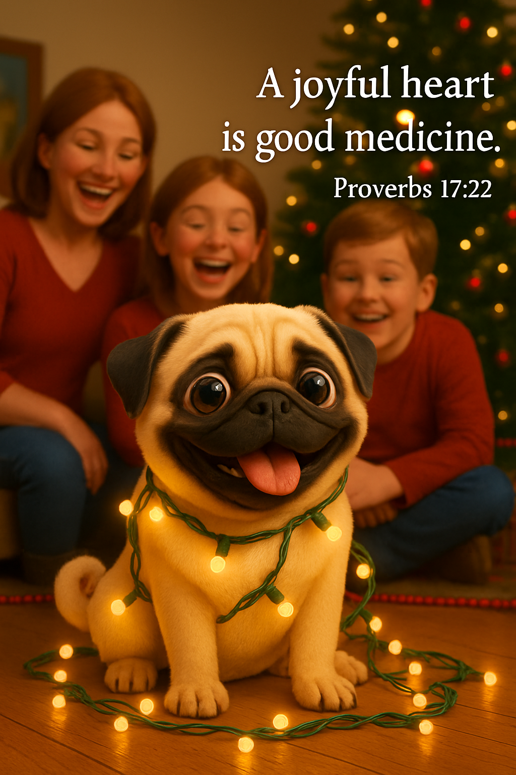 Celebrate the healing power of joy with this Christian wall art featuring Proverbs 17:22. A cheerful cartoon-style pug sits on a red carpet wrapped in glowing yellow Christmas lights, surrounded by laughing children and a glowing Christmas tree. This printable radiates warmth, delight, and spiritual comfortβperfect for Christmas scripture decor, ministry bundles, devotional gifts, and inspirational holiday printables.