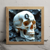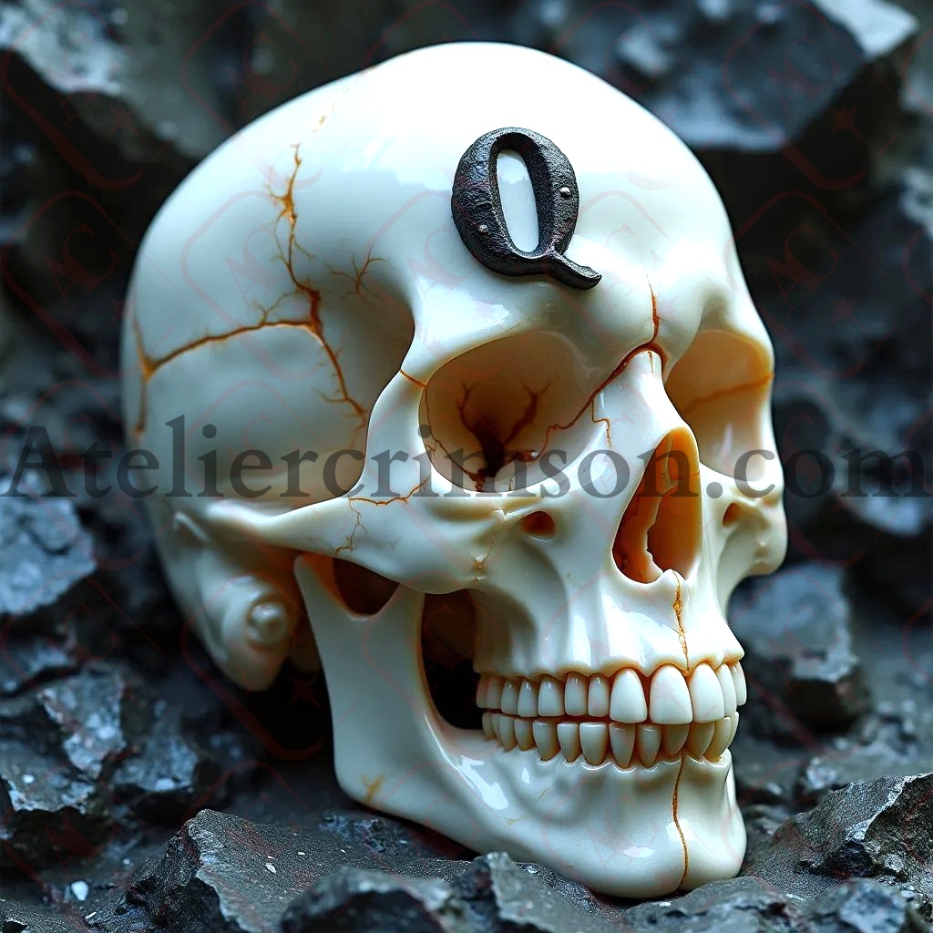 The letter Q skull obsidian marble deeply engraved character on the forehead of a white marble skull. The character, filled with dark obsidian, contrasts sharply against the pale skull. Set against a black crystalline background, the skull and character dominate the image.