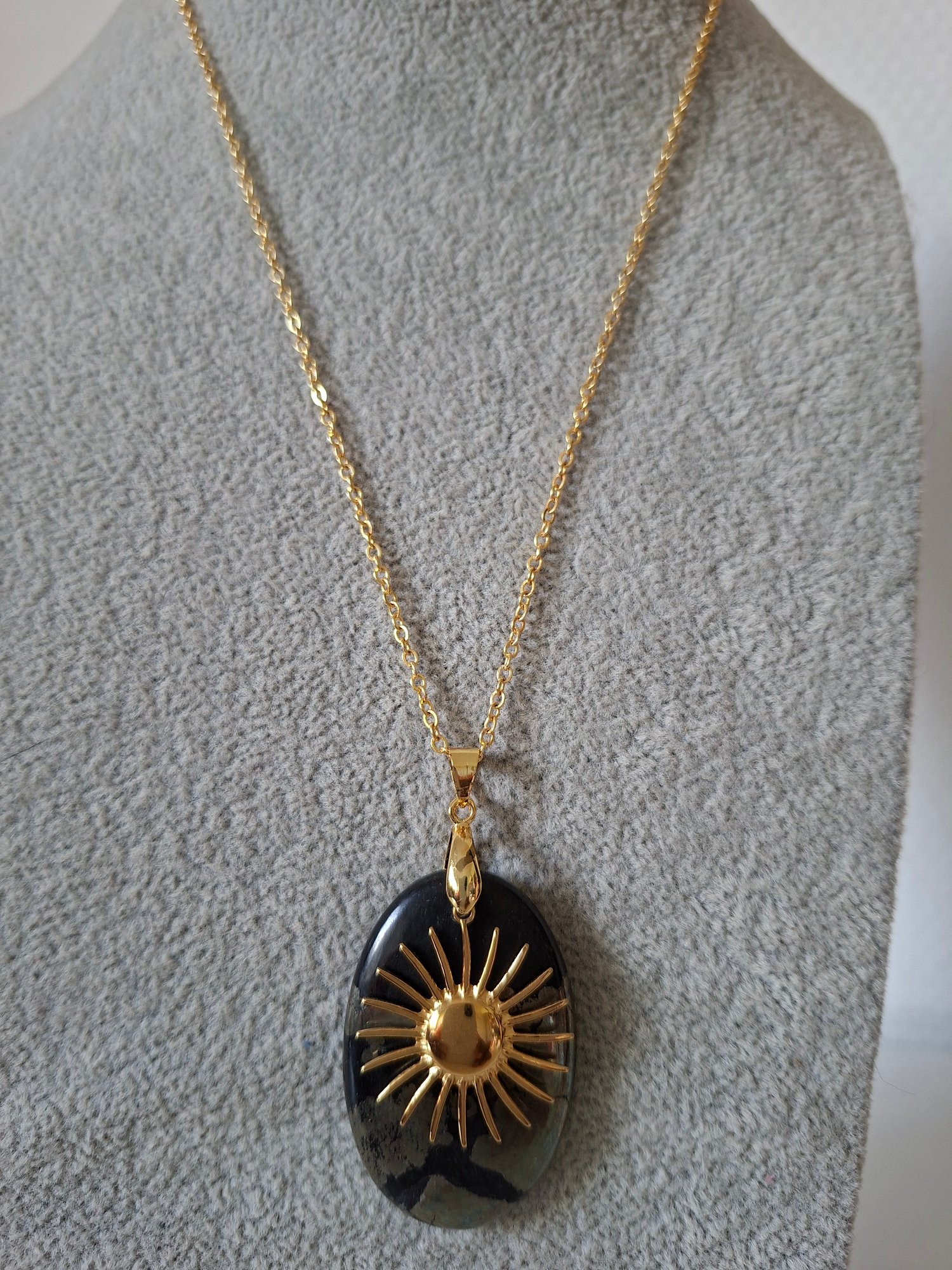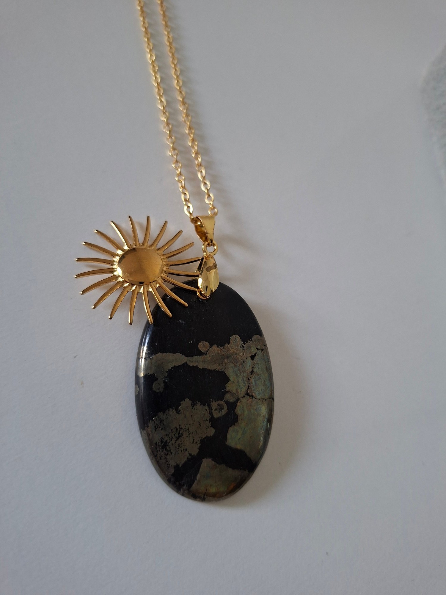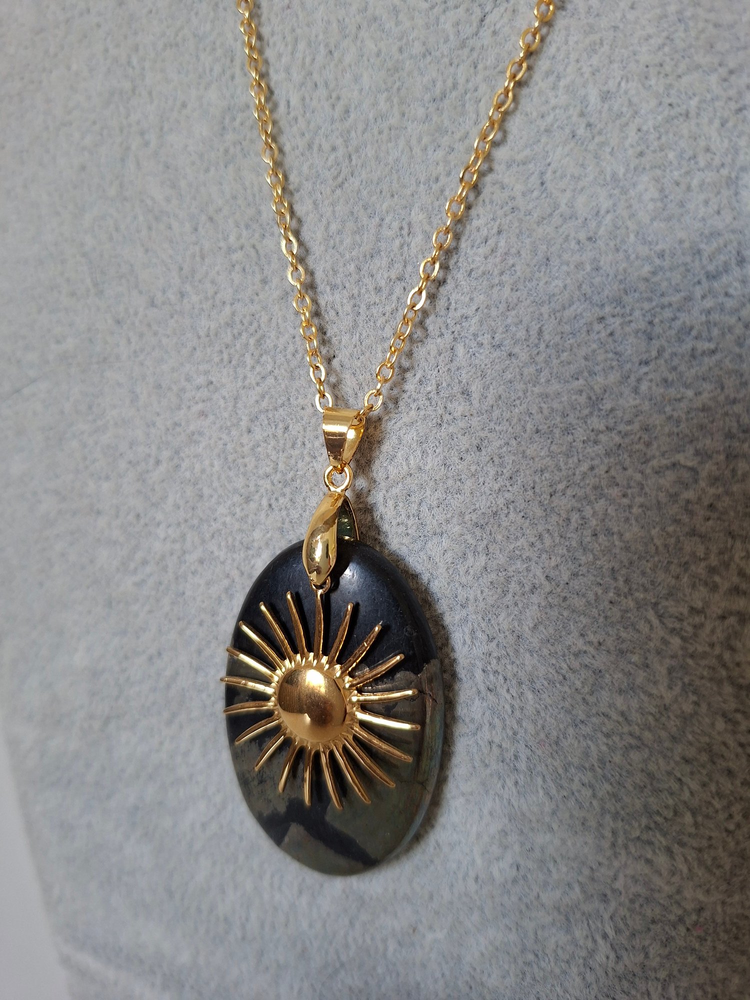 • Pendentif en pyrite naturelle avec motif soleil doré