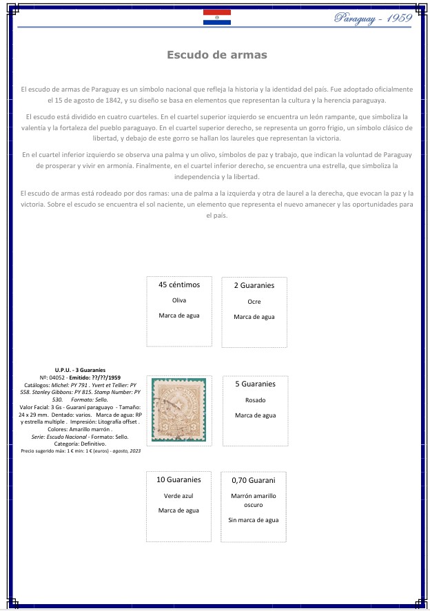 Ficha digital en formato PDF correspondiente a la serie de sellos emitidos por Paraguay en 1959 dedicados al Escudo de Armas. Esta hoja está identificada en el Catálogo Sooluciones como PY-1959-xxxx-xx-04052-xxx-xx-xx-xx-xx-xx-xxx-xx-xx y forma parte de una colección personal puesta a disposición de otros coleccionistas.