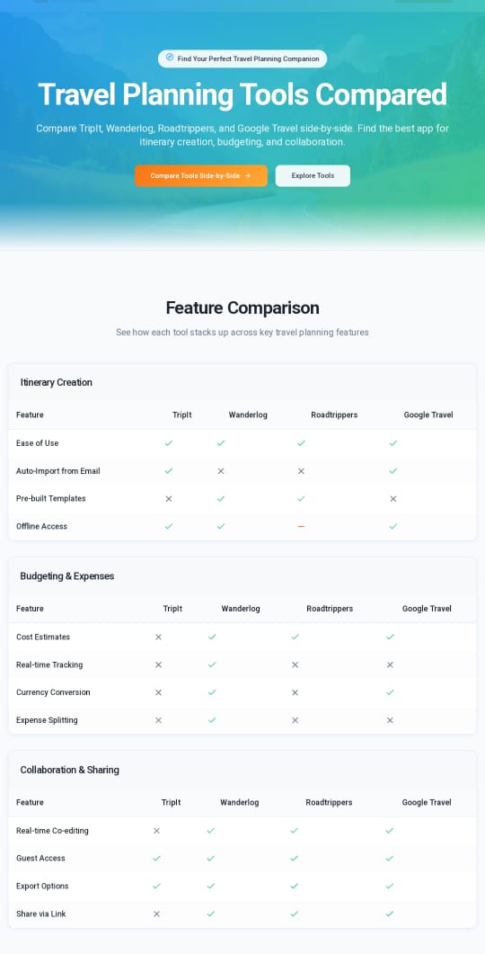 This template features a clean, modern UI with intuitive navigation, high-impact visuals, and a detailed feature-by-feature comparison of TripIt, Wanderlog, Roadtrippers, and Google Travel — focusing on itinerary creation, budgeting, and collaboration.