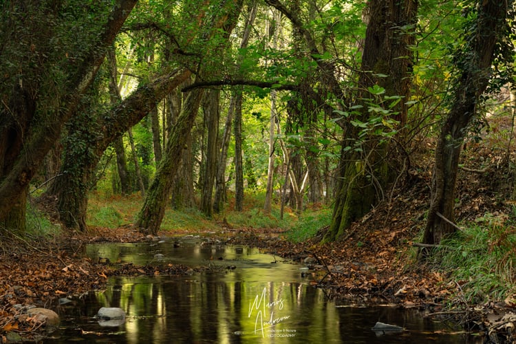 Step into the heart of the forest, where a rich tapestry of life unfolds. This photograph captures the vibrant, layered beauty of a dense woodland, with sunlight filtering through the canopy to illuminate a world of texture and colour. Tall tree trunks, some wrapped in ancient ivy, rise from a lush bed of ferns and foliage, creating a scene of profound depth and natural wonder.
