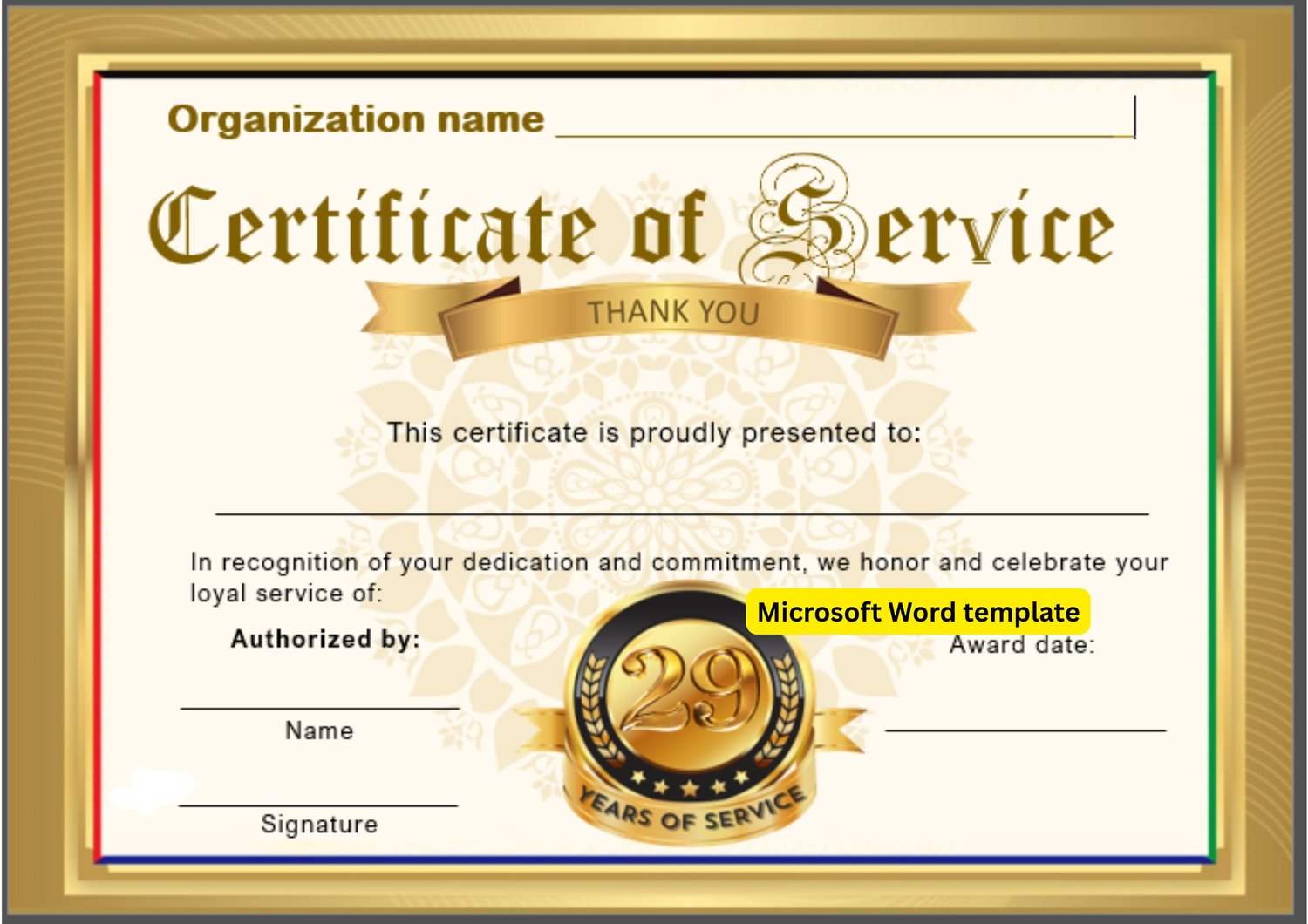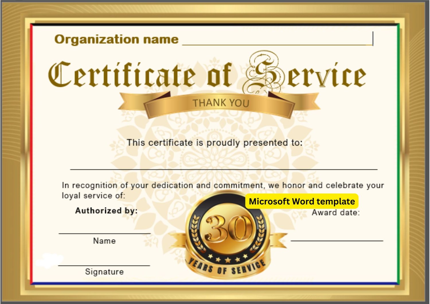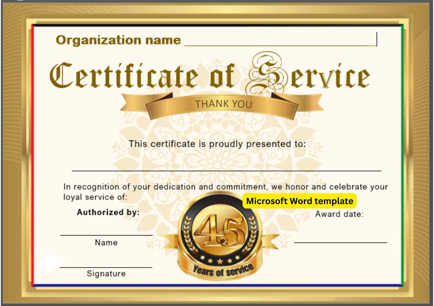 This is a professional landscape certificate template to recognize years of service. Fully editable in Microsoft Word — customize with names, dates, and details
