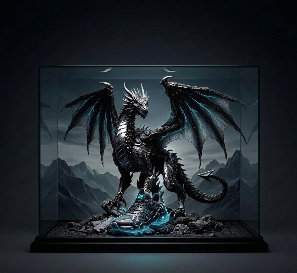 This piece blends bold dragon design with sneaker-inspired styling, presented in a striking smoky black, gray and turquoise toned color palette.