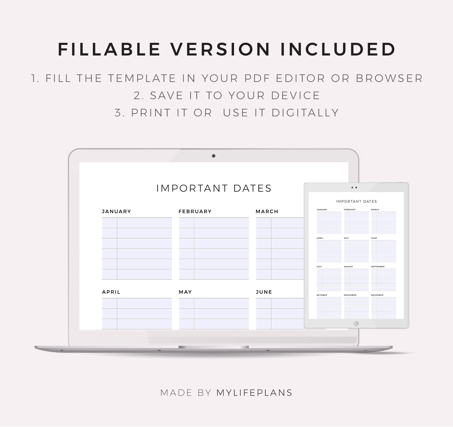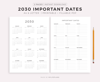 2030 Calendar and Important Dates Page Printable - Birthdays, Anniversaries, Travels, Doctor Appointments, Car Maintenance, ect, A4/Letter Size