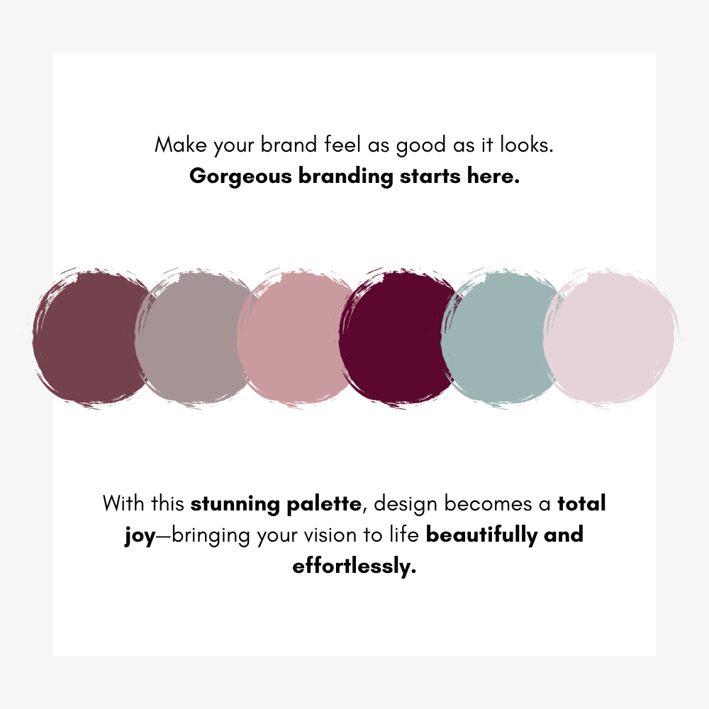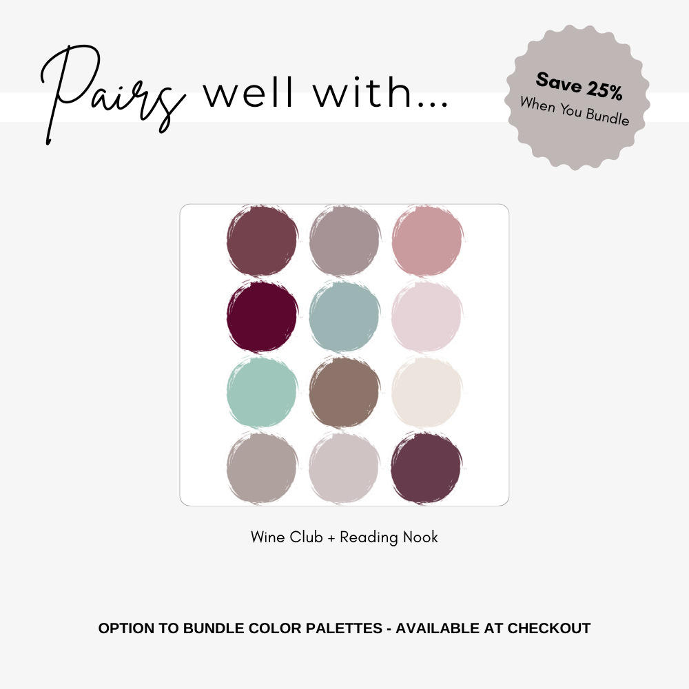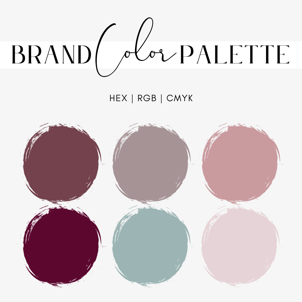 Elevate your branding design with our Wine Club Color Palette—a sophisticated blend of muted plum, mauve taupe, dusty rose, cabernet red, dusty teal, and pale pink. Perfect for creative small businesses looking to establish a soft and moody aesthetic, this palette is curated to enhance your brand's visual identity across various platforms. Whether you're designing a website color scheme, social media graphics, shop banners, or logos, these harmonious hues will create a cohesive and inviting atmosphere.