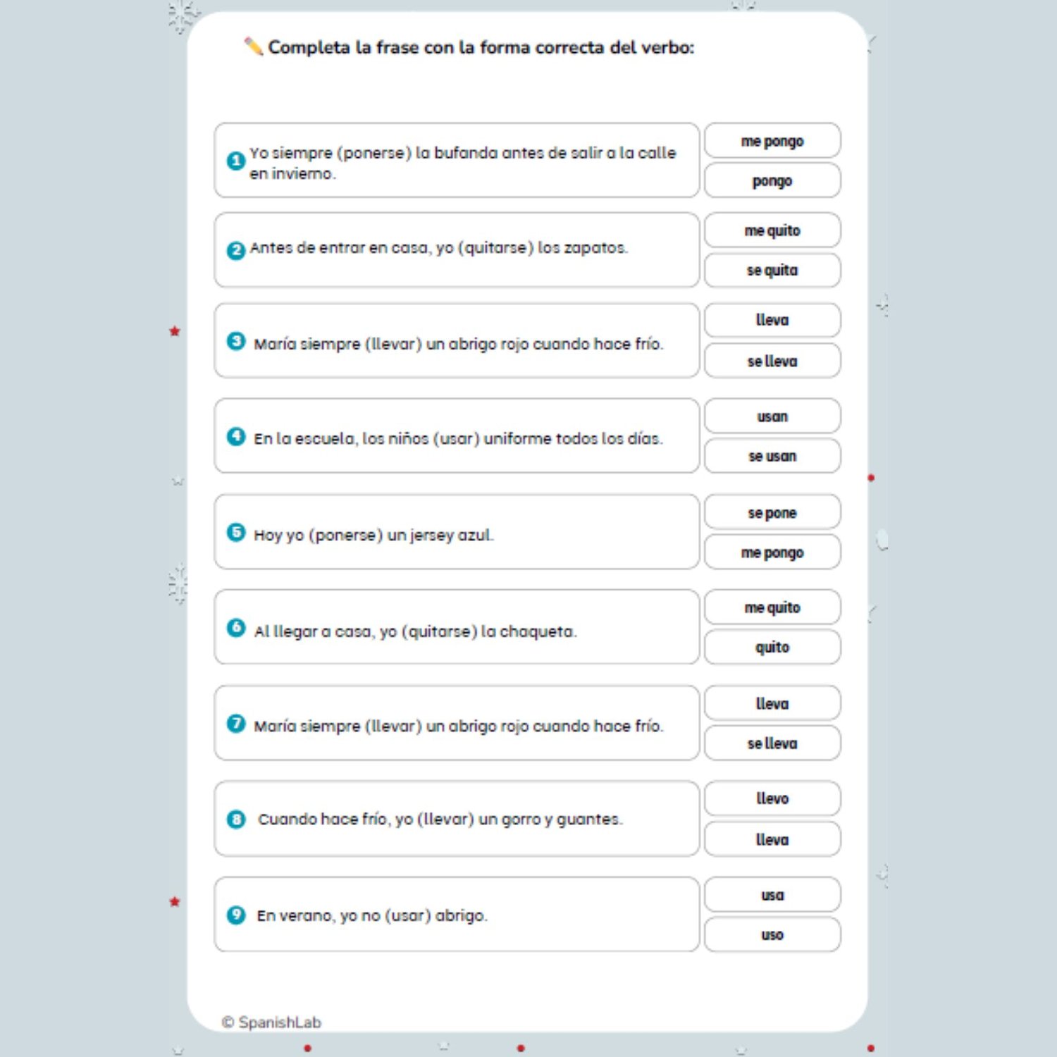 Help your students master Spanish clothing verbs with this clear and engaging worksheet set. Learners practice the difference between ponerse, llevar, quitarse, usar, and llevar puesto, understanding when these verbs express actions and when they describe habits or appearance.