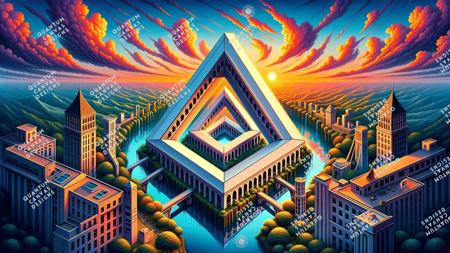 Penrose Triangle Illusion, set within a scene that incorporates architectural elements