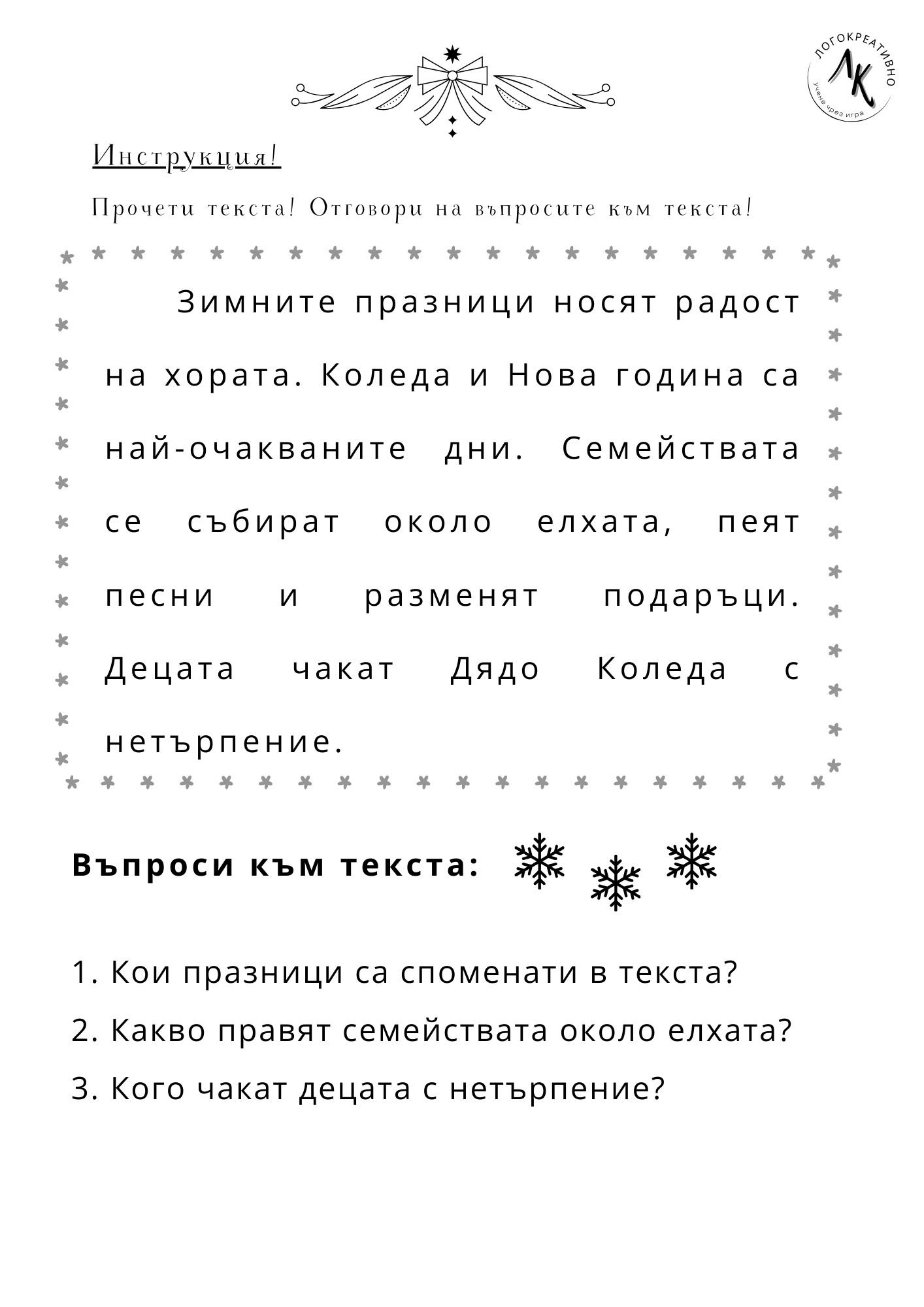 ❄️ „Приказна зима-кратки текстове за малки читатели“ подпомага изграждането на ключови умения по четене и разбиране чрез увлекателни текстове и разнообразни упражнения.☃️📘