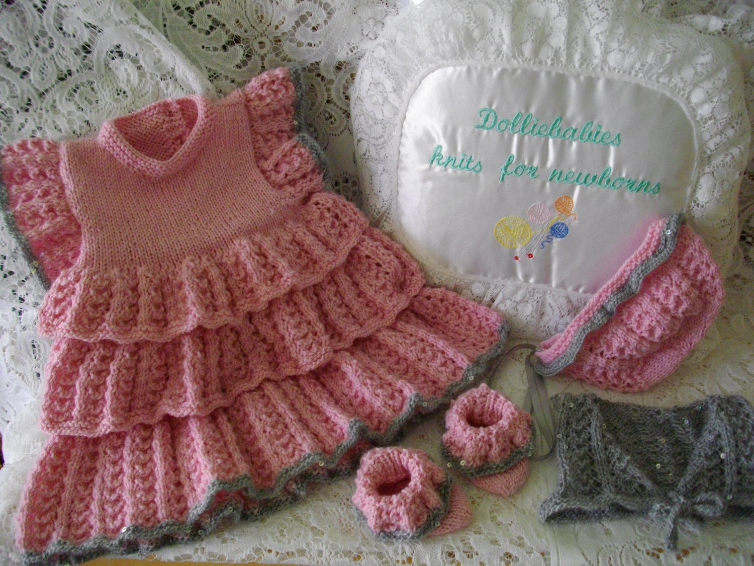 Instant download PDF knitting pattern to knit a baby or reborn doll rah-rah dress set, comprising a three-layered dress, cropped waistcoat, frilled bonnet and frilly socks in a lacy stitch pattern.
