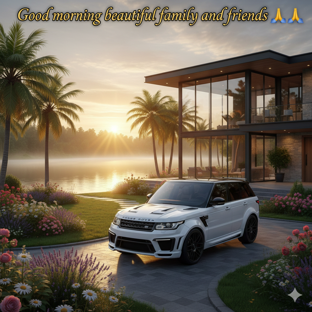 A beautiful good morning sunrise scene featuring a luxurious modern lake house with large glass windows reflecting the soft golden sunrise over calm water, elegant contemporary architecture, surrounded by a beautifully landscaped garden with green lawns, colorful flowers, palm trees, and stone pathways. In the driveway, a white Range Rover Sport with a full Brabus custom body kit, aggressive styling, matte black mag wheels, glossy finish, parked at a slight angle for a cinematic look. Warm golden sunlight casting soft rays across the lake, light morning mist over the water, peaceful and uplifting atmosphere, ultra-realistic, high detail, 8K resolution, vibrant colors, professional real estate photography style.