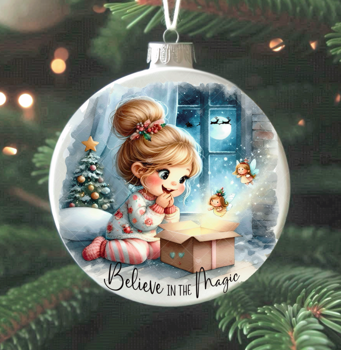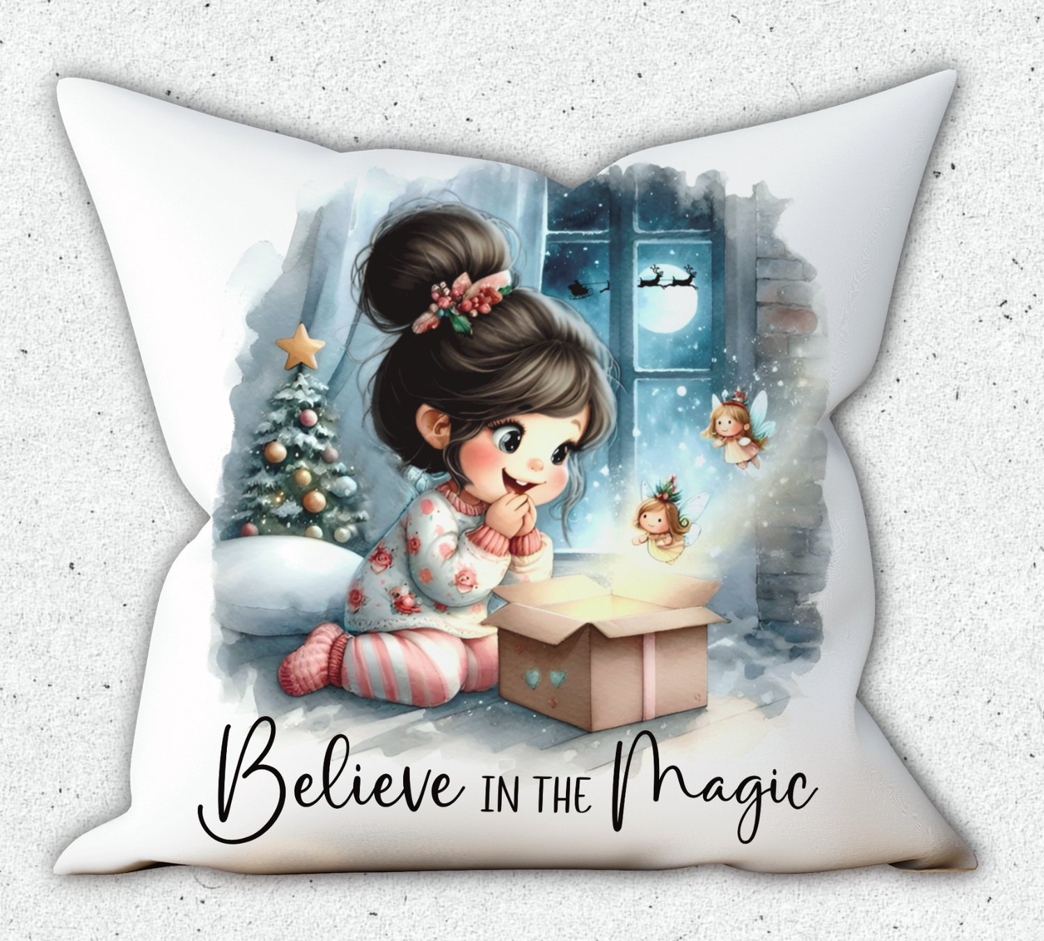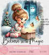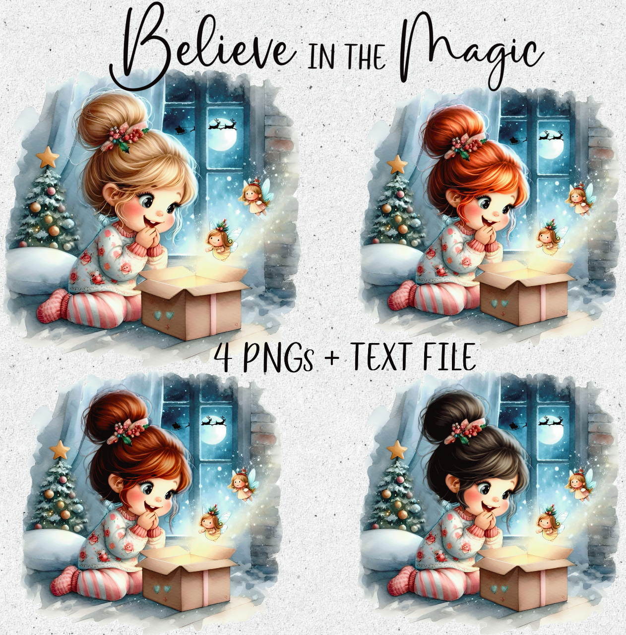 Believe in the magic. Beautiful little girl opening a magical box to reveal gorgeous little Christmas fairies. Blonde, brunette, black, brunette hair, darker skin tone. 5 PNG + text file