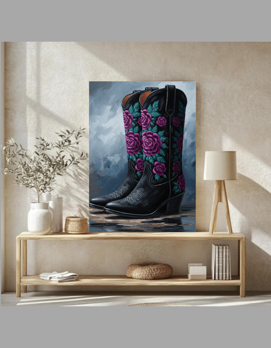Elevate your space with this stunning Purple Rose Floral Cowboy Boots Wall Art Printable PNG Digital Download! Perfect for western decor enthusiasts, this high-resolution 300 DPI PNG features intricate black cowboy boots adorned with vibrant purple roses and green leaves in a realistic painted style. Ideal as cowgirl wall decor, retro boots print, or printable wall art for your home, office, or gallery wall.