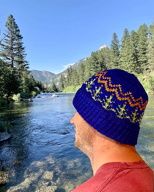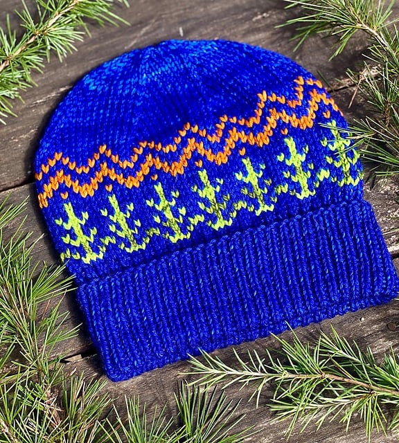 This handsome beanie is named after my outdoorsman son, Parker. The fold up brim adds extra cozy on the ears. Pine trees and a mountain range all under a great big sky. This stranded worsted weight color work design that uses three colors will sure to be a hit with your guys (and gals)!