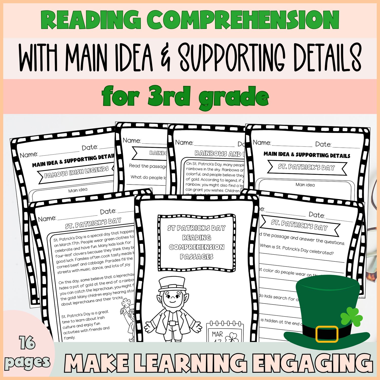 These St Patrick's Day Reading Comprehension Passages are fun! Kids will read fun stories about the holiday and learn to find the main idea, which is what the story is mostly about. They will also look for supporting details, important facts that help explain the main idea.