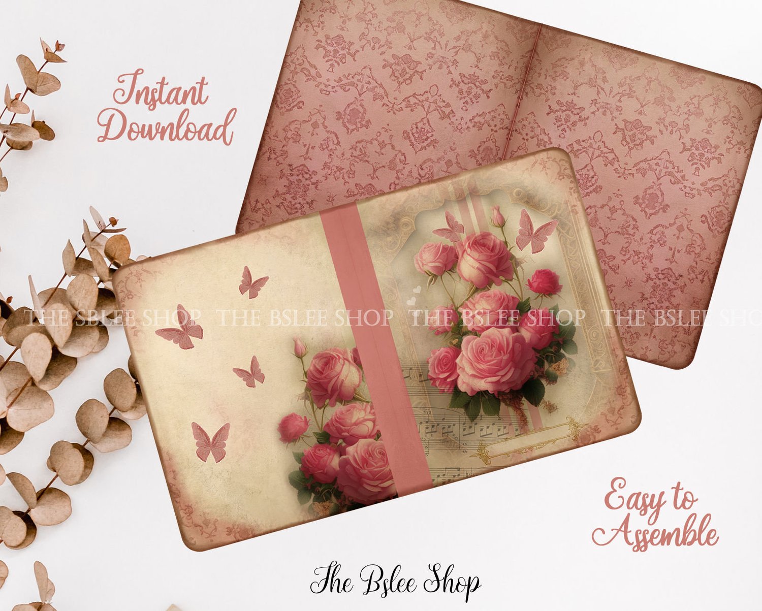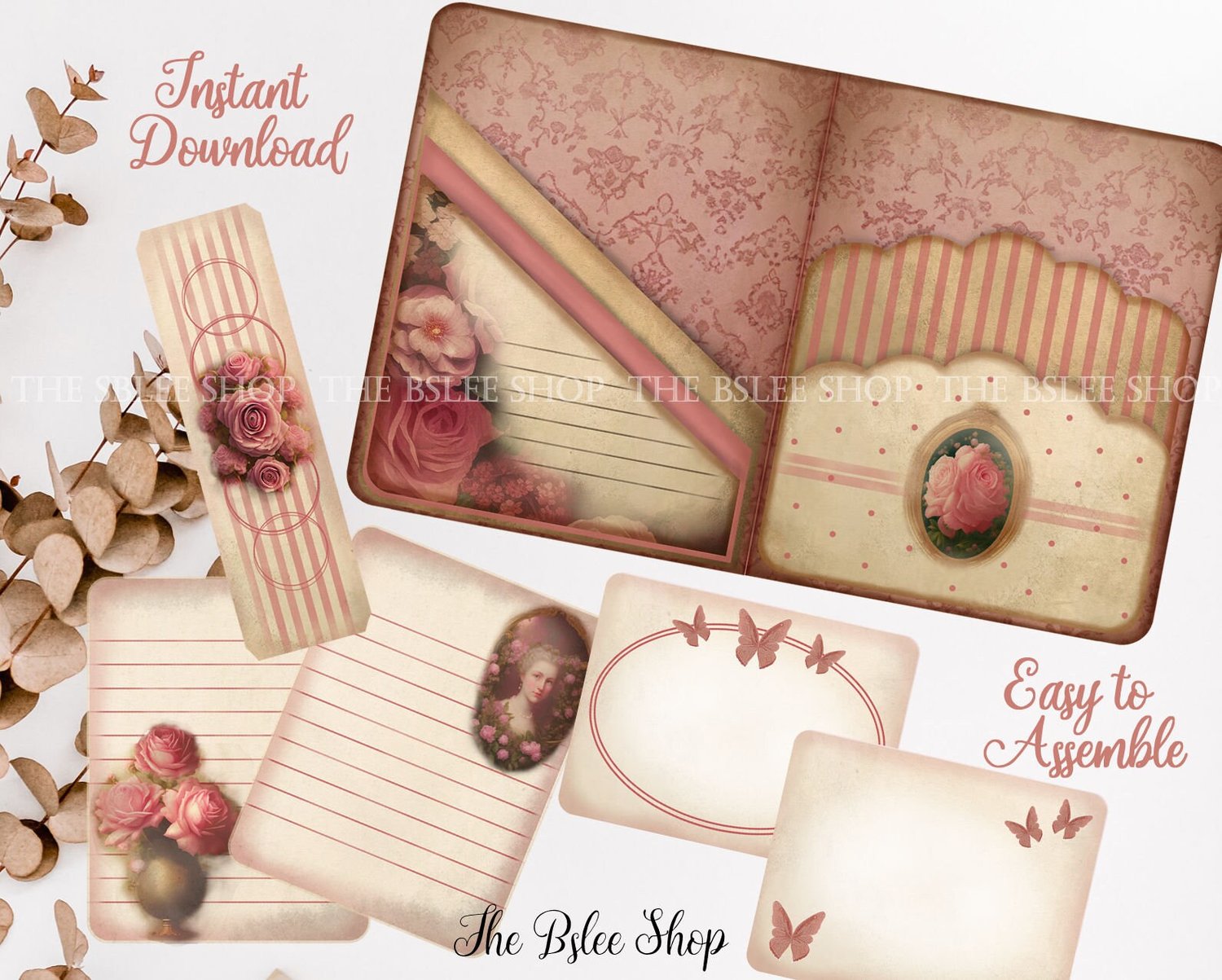 Vintage Floral Folio Kit, Shabby Pink Rose Folio, Vintage Roses Scrapbooking, DIY Printable Folder, Ephemera Kit, Victorian Writing Paper