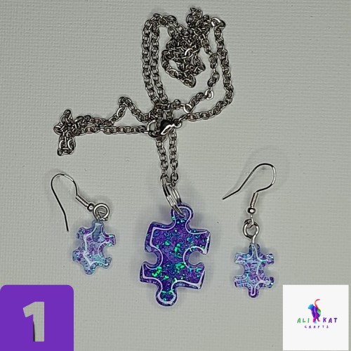Purple and green shimmer jigsaw shaped earrings (silver) and necklace (silver chain) matching set.
